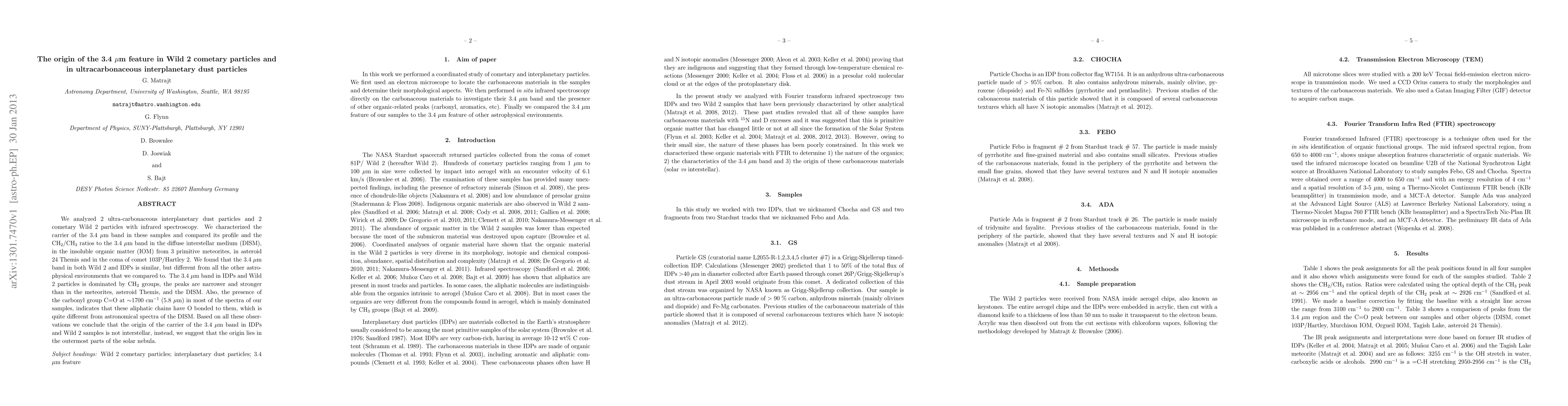 We analyzed 2 ultra-carbonaceous interplanetary dust particles and 2 cometary Wild 2 particles with infrared spectroscopy. We characterized the carrier of the 3.4 micron band in these samples and compared its profile and the CH2/CH3 ratios to the 3.4 micron band in the diffuse interstellar medium (DISM), in the insoluble organic matter (IOM) from 3 primitive meteorites, in asteroid 24 Themis and in the coma of comet 103P/Hartley 2. We found that the 3.4 micron band in both Wild 2 and IDPs is similar, but different from all the other astrophysical environments that we compared to. The 3.4 micron band in IDPs and Wild 2 particles is dominated by CH2 groups, the peaks are narrower and stronger than in the meteorites, asteroid Themis, and the DISM. Also, the presence of the carbonyl group C=O at 1700 cm-1 (5.8 micron) in most of the spectra of our samples, indicates that these aliphatic chains have O bonded to them, which is quite different from astronomical spectra of the DISM. Based on all these observations we conclude that the origin of the carrier of the 3.4 micron band in IDPs and Wild 2 samples is not interstellar, instead, we suggest that the origin lies in the outermost parts of the solar nebula.