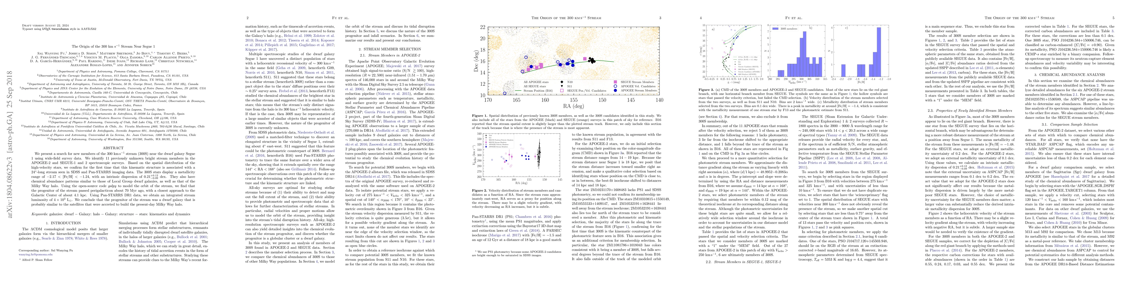 We present a search for new members of the 300 km s$^{-1}$ stream (300S) near the dwarf galaxy Segue 1 using wide-field survey data. We identify 11 previously unknown bright stream members in the APOGEE-2 and SEGUE-1 and 2 spectroscopic surveys. Based on the spatial distribution of the high-velocity stars, we confirm for the first time that this kinematic structure is associated with a 24$^{\circ}$-long stream seen in SDSS and Pan-STARRS imaging data. The 300S stars display a metallicity range of $-2.17 < {\rm [Fe/H]} < -1.24$, with an intrinsic dispersion of 0.21$_{-0.09}^{+0.12}$ dex. They also have chemical abundance patterns similar to those of Local Group dwarf galaxies, as well as that of the Milky Way halo. Using the open-source code galpy to model the orbit of the stream, we find that the progenitor of the stream passed perigalacticon about 70 Myr ago, with a closest approach to the Galactic Center of about 4.1 kpc. Using Pan-STARRS DR1 data, we obtain an integrated stream luminosity of $4 \times 10^3$ L$_{\odot}$. We conclude that the progenitor of the stream was a dwarf galaxy that is probably similar to the satellites that were accreted to build the present-day Milky Way halo.