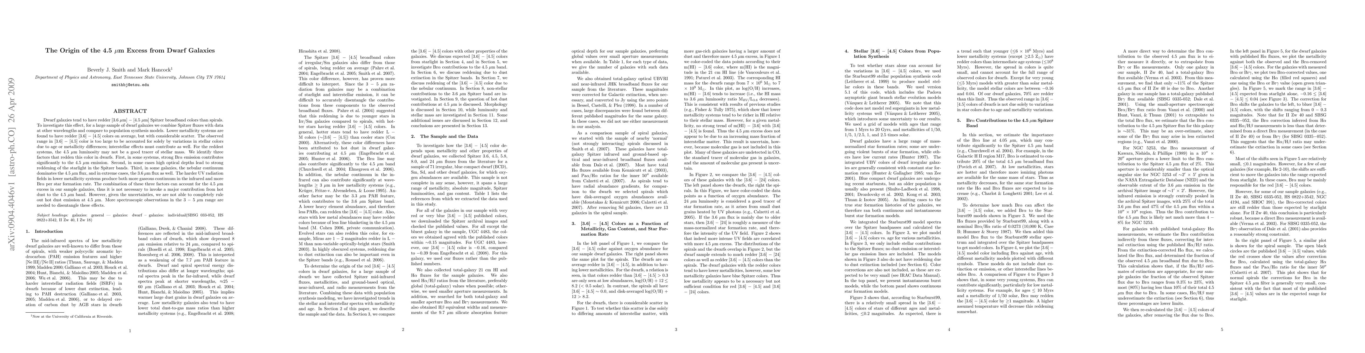 This study investigates the 4.5 micron excess in dwarf galaxies, finding that lower metallicity systems exhibit redder [3.6] - [4.5] colors due to factors like Br-alpha emission, high optical depths, and nebular continuum. These factors, rather than hot dust, account for the observed excess, though hot dust contribution cannot be entirely ruled out.