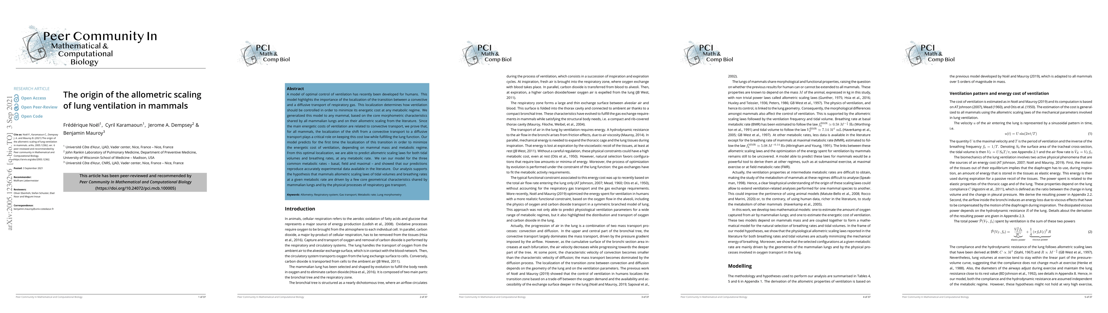 A model predicts that lung ventilation in mammals is optimized based on mass and metabolic rate, leading to accurate predictions of tidal volumes and breathing rates. The study supports the idea that mammals share common scaling laws for respiratory functions due to shared lung characteristics and gas transport processes.