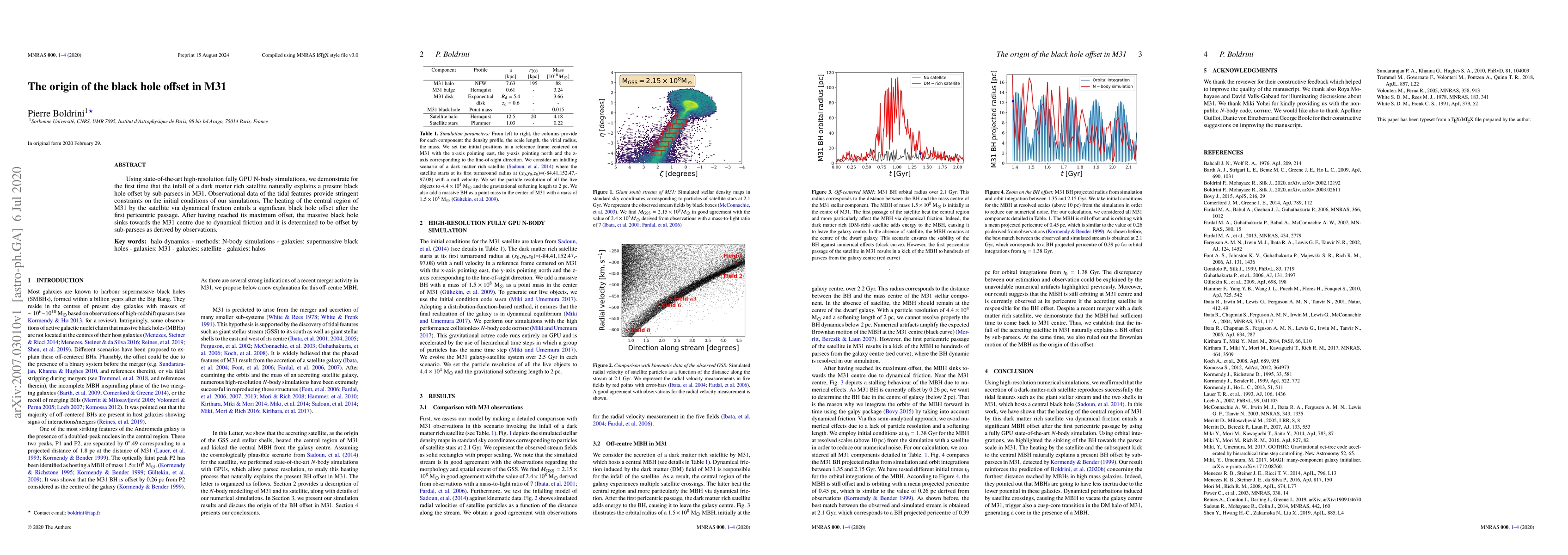 Researchers used computer simulations to show that a dark matter-rich satellite's infall naturally explains a black hole offset of less than 1 parsec in the Andromeda galaxy M31. The simulations matched observational data on tidal features, predicting a significant black hole offset after its first pericentric passage.