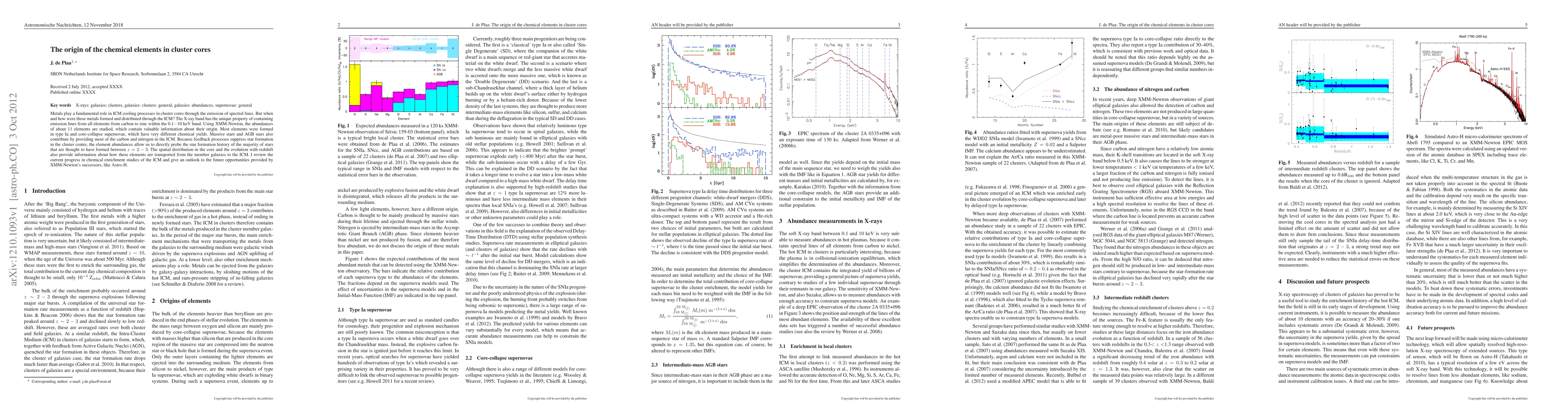 Metals play a fundamental role in ICM cooling processes in cluster cores through the emission of spectral lines. But when and how were these metals formed and distributed through the ICM? The X-ray band has the unique property of containing emission lines from all elements from carbon to zinc within the 0.1-10 keV band. Using XMM-Newton, the abundances of about 11 elements are studied, which contain valuable information about their origin. Most elements were formed in type Ia and core-collapse supernovae, which have very different chemical yields. Massive stars and AGB stars also contribute by providing most of the carbon and nitrogen in the ICM. Because feedback processes suppress star formation in the cluster centre, the element abundances allow us to directly probe the star formation history of the majority of stars that are thought to have formed between z=2-3. The spatial distribution in the core and the evolution with redshift also provide information about how these elements are transported from the member galaxies to the ICM. I review the current progress in chemical enrichment studies of the ICM and give an outlook to the future opportunities provided by XMM-Newton's successors, like Astro-H.
