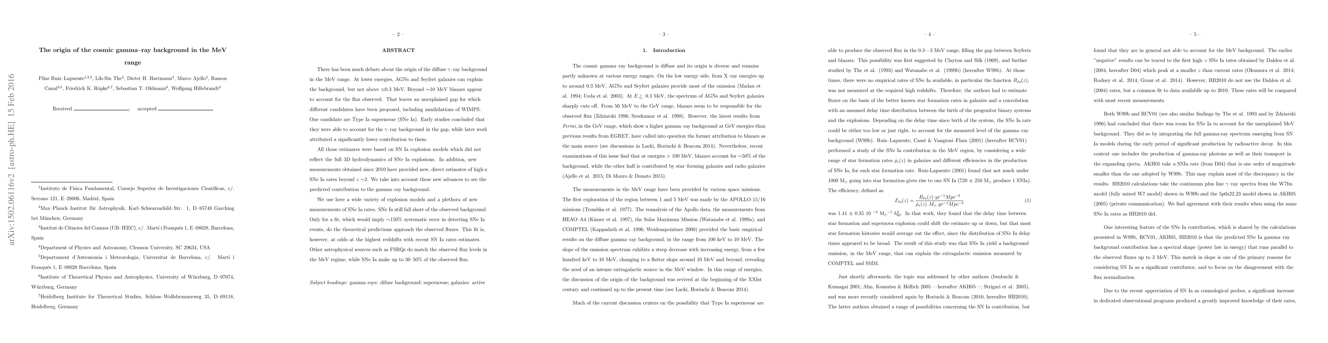 There has been much debate about the origin of the diffuse $\gamma$--ray background in the MeV range. At lower energies, AGNs and Seyfert galaxies can explain the background, but not above $\simeq$0.3 MeV. Beyond $\sim$10 MeV blazars appear to account for the flux observed. That leaves an unexplained gap for which different candidates have been proposed, including annihilations of WIMPS. One candidate are Type Ia supernovae (SNe Ia). Early studies concluded that they were able to account for the $\gamma$--ray background in the gap, while later work attributed a significantly lower contribution to them. All those estimates were based on SN Ia explosion models which did not reflect the full 3D hydrodynamics of SNe Ia explosions. In addition, new measurements obtained since 2010 have provided new, direct estimates of high-z SNe Ia rates beyond $z\sim$2. We take into account these new advances to see the predicted contribution to the gamma--ray background. We use here a wide variety of explosion models and a plethora of new measurements of SNe Ia rates. SNe Ia still fall short of the observed background. Only for a fit, which would imply $\sim$150\% systematic error in detecting SNe Ia events, do the theoretical predictions approach the observed fluxes. This fit is, however, at odds at the highest redshifts with recent SN Ia rates estimates. Other astrophysical sources such as FSRQs do match the observed flux levels in the MeV regime, while SNe Ia make up to 30--50\% of the observed flux.