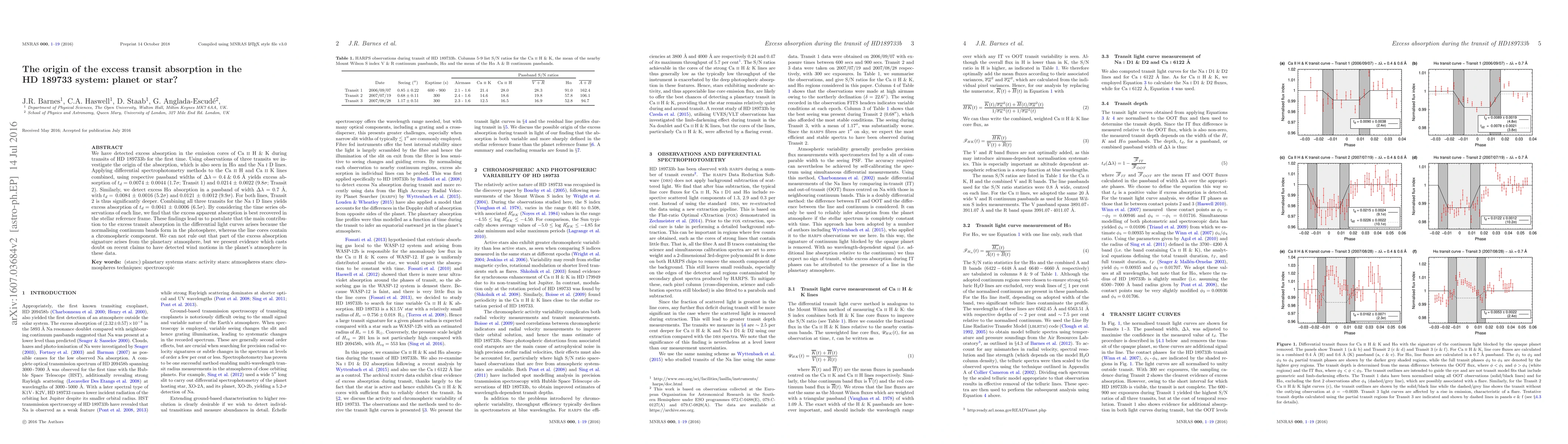 We have detected excess absorption in the emission cores of Ca II H & K during transits of HD 189733b for the first time. Using observations of three transits we investigate the origin of the absorption, which is also seen in H{\alpha} and the Na I D lines. Applying differential spectrophotometry methods to the Ca II H and Ca II K lines combined, using respective passband widths of $\Delta\lambda$ = 0.4 & 0.6 \AA\ yields excess absorption of t$_d$ = 0.0074 $\pm$ 0.0044 (1.7$\sigma$; Transit 1) and 0.0214 +/- 0.0022 (9.8$\sigma$; Transit 2). Similarly, we detect excess H{\alpha} absorption in a passband of width $\Delta\lambda$ = 0.7 \AA, with t$_d$ = 0.0084 $\pm$ 0.0016 (5.2$\sigma$) and 0.0121 $\pm$ 0.0012 (9.9$\sigma$). For both lines, Transit 2 is thus significantly deeper. Combining all three transits for the Na I D lines yields excess absorption of t$_d$ = 0.0041 $\pm$ 0.0006 (6.5$\sigma$). By considering the time series observations of each line, we find that the excess apparent absorption is best recovered in the stellar reference frame. These findings lead us to postulate that the main contribution to the excess transit absorption in the differential light curves arises because the normalising continuum bands form in the photosphere, whereas the line cores contain a chromospheric component. We can not rule out that part of the excess absorption signature arises from the planetary atmosphere, but we present evidence which casts doubt on recent claims to have detected wind motions in the planet's atmosphere in these data.