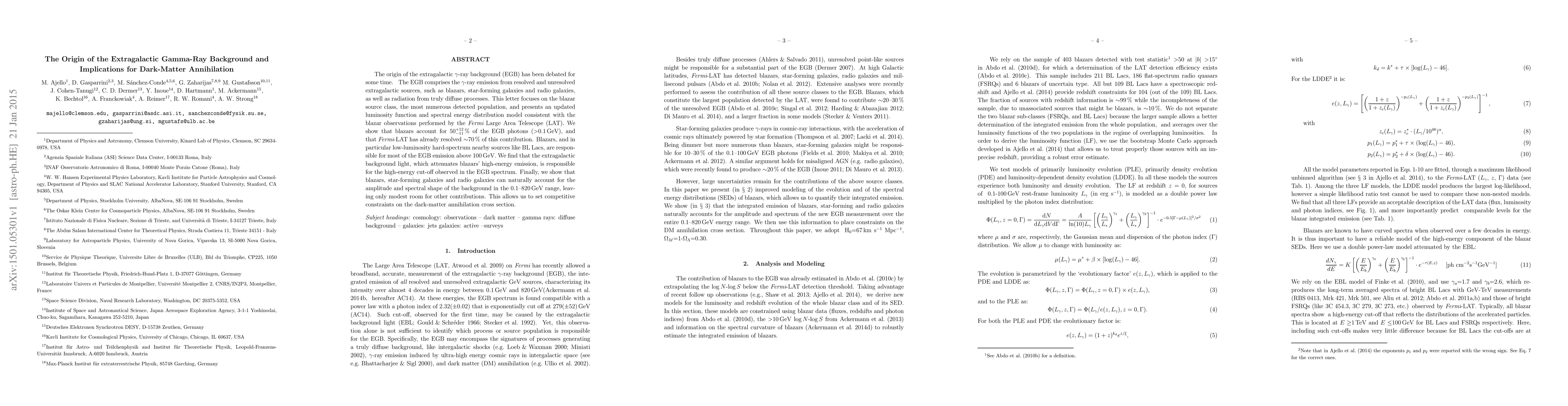 This paper investigates the extragalactic gamma-ray background (EGB) and finds that blazars account for a significant portion, particularly above 100 GeV. The study sets constraints on the dark-matter annihilation cross section based on the observed gamma-ray emissions from blazars, star-forming galaxies, and radio galaxies.