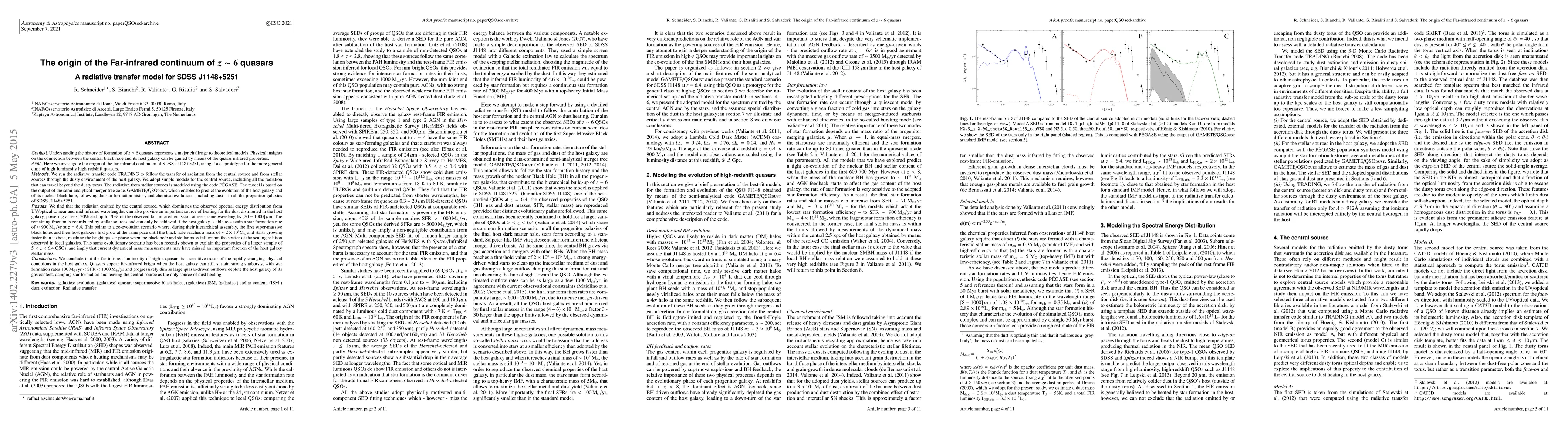 This paper uses radiative transfer modeling to investigate the origin of the far-infrared continuum in the high-redshift quasar SDSS J1148+5251, finding that central source radiation powers up to 70% of the observed FIR emission. The study suggests a co-evolutionary scenario where supermassive black holes and their host galaxies grow together until the black hole outpaces the galaxy, highlighting the FIR luminosity as a tracer of host galaxy conditions.