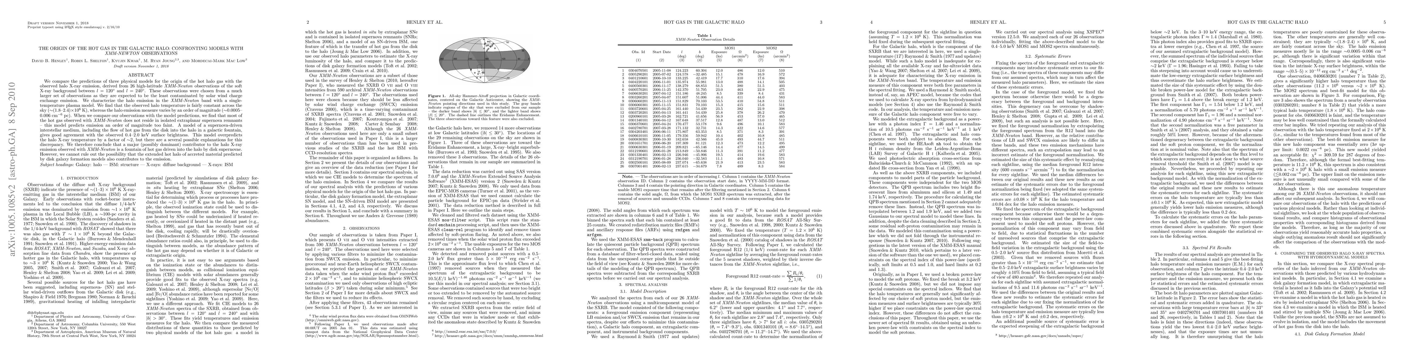 This paper compares three models of the hot gas origin in the galactic halo against XMM-Newton observations, finding that a galactic fountain model driven by disk supernovae best matches the observed X-ray emission, though it slightly overpredicts the temperature. It suggests the fountain model is a major contributor to the halo's X-ray emission, but acknowledges potential contributions from accreted material.