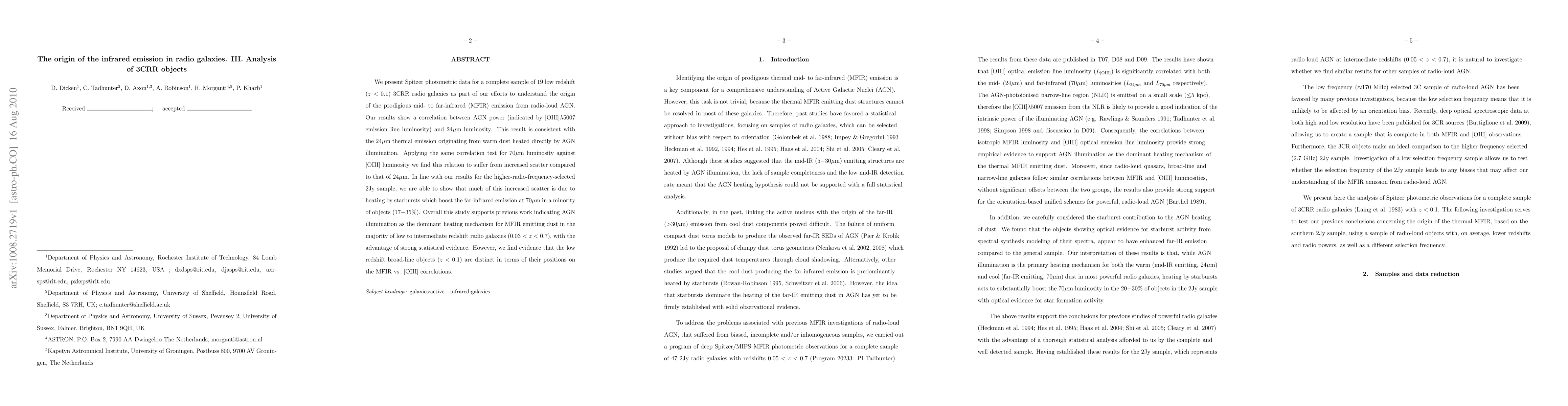This study uses Spitzer data to analyze the infrared emission in 19 low redshift 3CRR radio galaxies, finding that AGN power correlates with 24 micron luminosity, indicating AGN-heated dust. The correlation weakens at 70 micron due to starburst heating in a minority of galaxies, supporting AGN as the main heating source in most low to intermediate redshift radio galaxies.