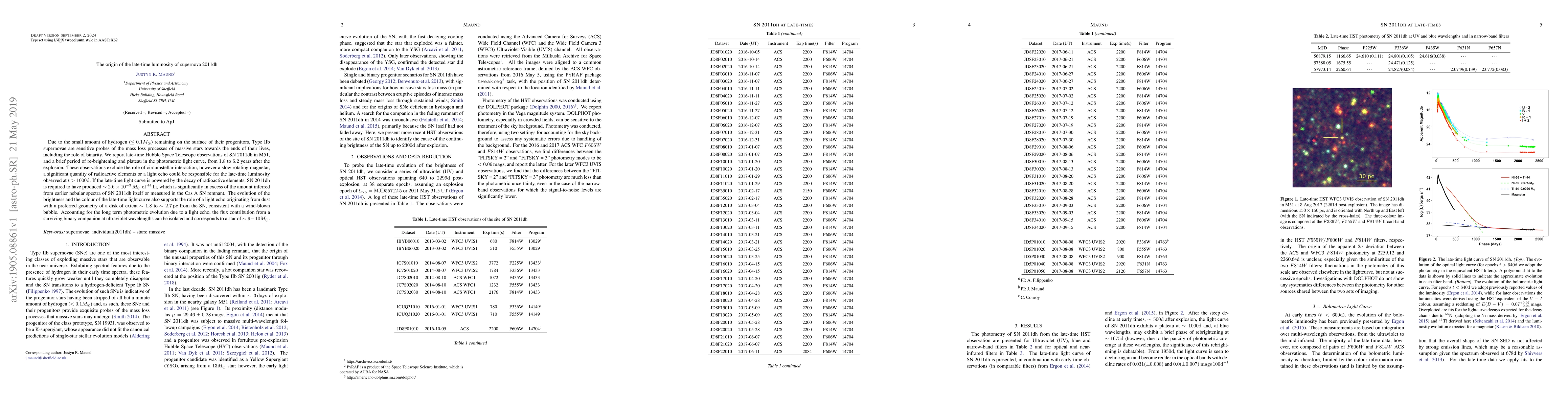 Due to the small amount of hydrogen (${\leq 0.1M_{\odot}}$) remaining on the surface of their progenitors, Type IIb supernovae are sensitive probes of the mass loss processes of massive stars towards the ends of their lives, including the role of binarity. We report late-time Hubble Space Telescope observations of SN 2011dh in M51, and a brief period of re-brightening and plateau in the photometric light curve, from $1.8$ to $6.2$ years after the explosion. These observations exclude the role of circumstellar interaction, however a slow rotating magnetar, a significant quantity of radioactive elements or a light echo could be responsible for the late-time luminosity observed at $t > 1000\mathrm{d}$. If the late-time light curve is powered by the decay of radioactive elements, SN~2011dh is required to have produced $\sim 2.6 \times 10^{-3}\,M_{\odot}$ of $\mathrm{^{44}Ti}$, which is significantly in excess of the amount inferred from earlier nebular spectra of SN 2011dh itself or measured in the Cas A SN remnant. The evolution of the brightness and the colour of the late-time light curve also supports the role of a light echo originating from dust with a preferred geometry of a disk of extent $\sim 1.8$ to $\sim 2.7\,\mathrm{pc}$ from the SN, consistent with a wind-blown bubble. Accounting for the long term photometric evolution due to a light echo, the flux contribution from a surviving binary companion at ultraviolet wavelengths can be isolated and corresponds to a star of $\sim 9 - 10M_{\odot}$.