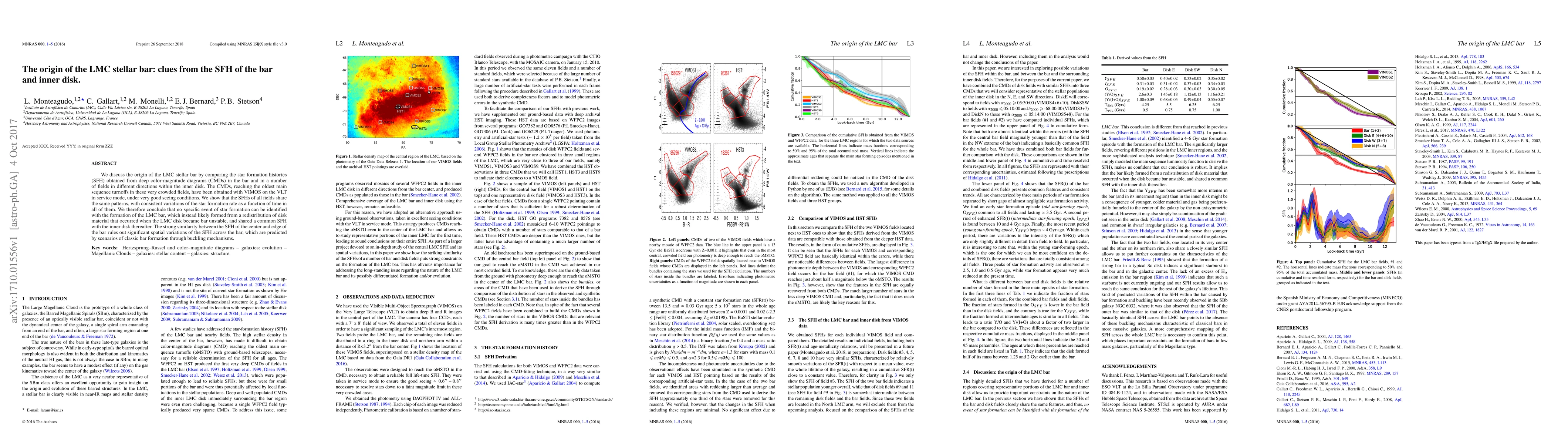 We discuss the origin of the LMC stellar bar by comparing the star formation histories (SFH) obtained from deep color-magnitude diagrams (CMDs) in the bar and in a number of fields in different directions within the inner disk. The CMDs, reaching the oldest main sequence turnoffs in these very crowded fields, have been obtained with VIMOS on the VLT in service mode, under very good seeing conditions. We show that the SFHs of all fields share the same patterns, with consistent variations of the star formation rate as a function of time in all of them. We therefore conclude that no specific event of star formation can be identified with the formation of the LMC bar, which instead likely formed from a redistribution of disk material that occurred when the LMC disk became bar unstable, and shared a common SFH with the inner disk thereafter. The strong similarity between the SFH of the center and edge of the bar rules out significant spatial variations of the SFH across the bar, which are predicted by scenarios of classic bar formation through buckling mechanisms.