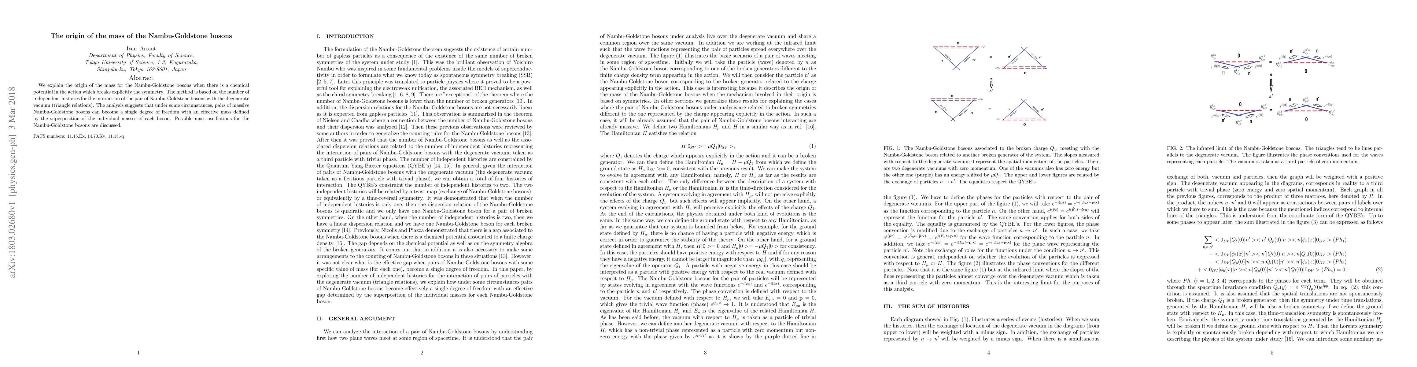We explain the origin of the mass for the Nambu-Goldstone bosons when there is a chemical potential in the action which breaks explicitly the symmetry. The method is based on the number of independent histories for the interaction of the pair of Nambu-Goldstone bosons with the degenerate vacuum (triangle relations). The analysis suggests that under some circumstances, pairs of massive Nambu-Goldstone bosons can become a single degree of freedom with an effective mass defined by the superposition of the individual masses of each boson. Possible mass oscillations for the Nambu-Goldstone bosons are discussed.