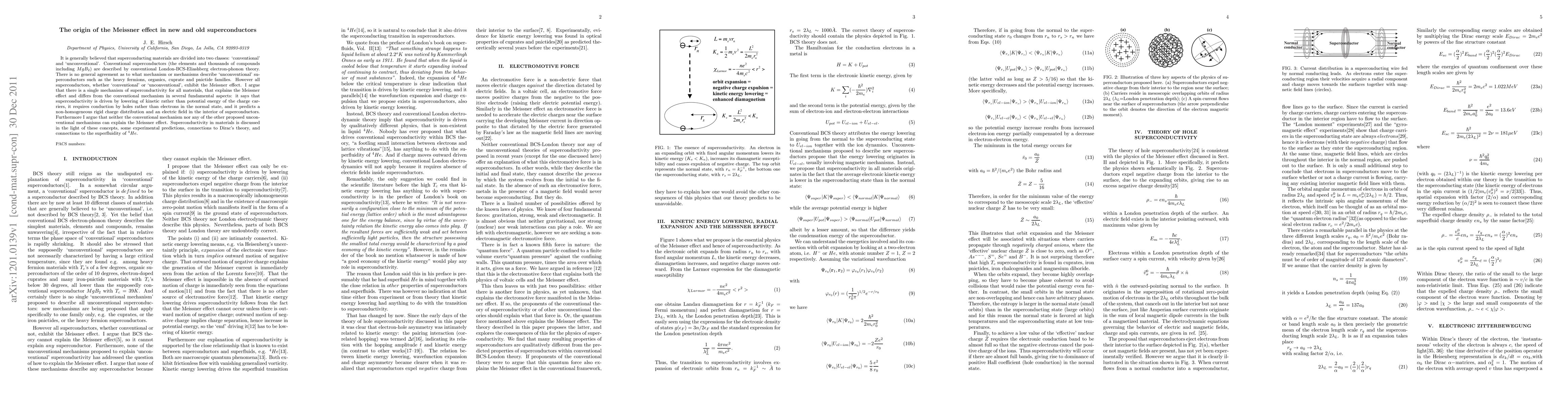 It is generally believed that superconducting materials are divided into two classes: `conventional' and `unconventional'. Conventional superconductors (the elements and thousands of compounds including $MgB_2$) are described by conventional London-BCS-Eliashberg electron-phonon theory. There is no general agreement as to what mechanism or mechanisms describe `unconventional' superconductors such as the heavy fermions, organics, cuprate and pnictide families. However all superconductors, whether `conventional' or `unconventional', exhibit the Meissner effect. I argue that there is a single mechanism of superconductivity for all materials, that explains the Meissner effect and differs from the conventional mechanism in several fundamental aspects: it says that superconductivity is driven by lowering of kinetic rather than potential energy of the charge carriers, it requires conduction by holes rather than electrons in the normal state, and it predicts a non-homogeneous rigid charge distribution and an electric field in the interior of superconductors. Furthermore I argue that neither the conventional mechanism nor any of the other proposed unconventional mechanisms can explain the Meissner effect. Superconductivity in materials is discussed in the light of these concepts, some experimental predictions, connections to Dirac's theory, and connections to the superfluidity of $^4He$.
