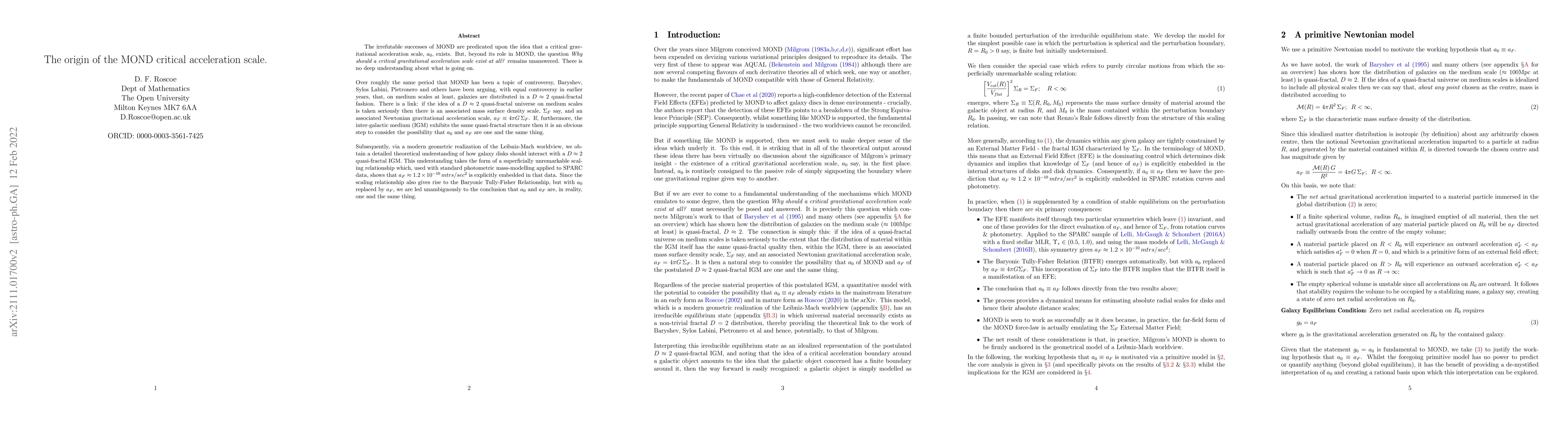 The irrefutable successes of MOND are predicated upon the idea that a critical gravitational acceleration scale, $a_0$, exists. But, beyond its role in MOND, the question: 'Why should a critical gravitational acceleration scale exist at all?' remains unanswered. There is no deep understanding about what is going on. Over roughly the same period that MOND has been a topic of controversy, Baryshev, Sylos Labini, Pietronero and others have been arguing, with equal controversy in earlier years, that, on medium scales at least, material in the universe is distributed in a quasi-fractal $D\approx 2$ fashion. There is a link: if the idea of a quasi-fractal $D \approx 2$ universe on medium scales is taken seriously then there is an associated characteristic mass surface density scale, $\Sigma_F$ say, and an associated characteristic gravitational acceleration scale, $a_F = 4 \pi G \Sigma_F$. If, furthermore, the quasi-fractal structure is taken to include the inter-galactic medium, then it is an obvious step to consider the possibility that $a_0$ and $a_F$ are the same thing. Subsequently, via a modern geometric realization of the Leibniz-Mach worldview, we obtain a detailed theoretical understanding of how galaxy disks should interact with a $D\approx 2$ quasi-fractal IGM. This understanding takes the form of a superficially unremarkable scaling relationship which, used with standard photometric mass-modelling applied to SPARC data, shows that $a_F \approx 1.2\times 10^{-10}\, mtrs/sec^2$ is explicitly embedded in that data. Since the scaling relationship also gives rise to the Baryonic Tully-Fisher Relationship, but with $a_0$ replaced by $a_F$, we are led unambiguously to the conclusion that $a_0$ and $a_F$ are, in reality, one and the same thing.