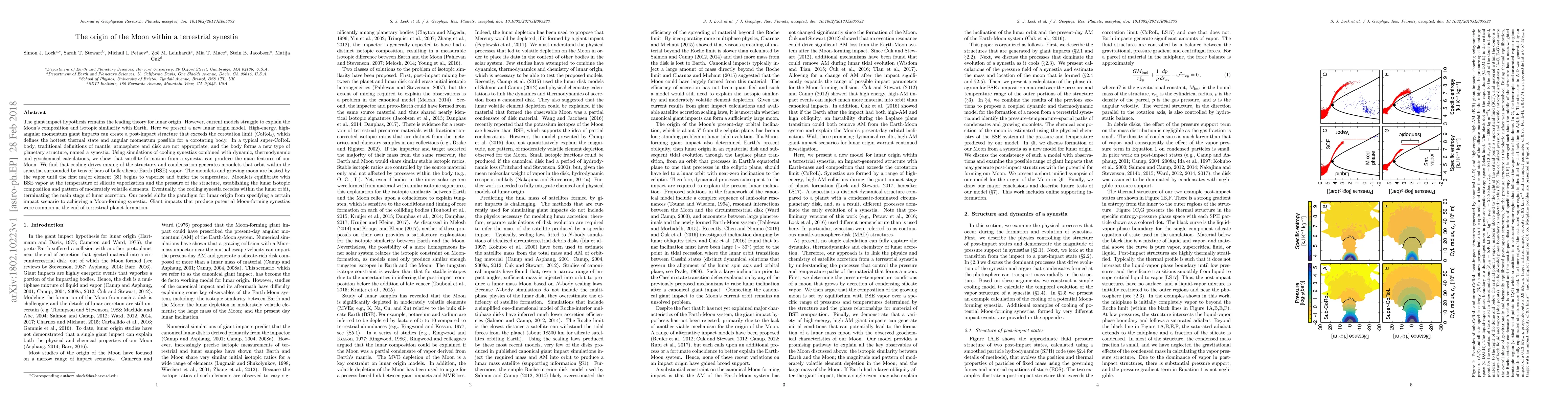 This paper proposes a new model for lunar origin, suggesting that the Moon formed from a synestia—a high-energy, high-angular momentum post-impact structure. This model explains the Moon's composition and isotopic similarity with Earth by showing how moonlets within the synestia equilibrate with vaporized Earth material, ultimately forming the Moon.