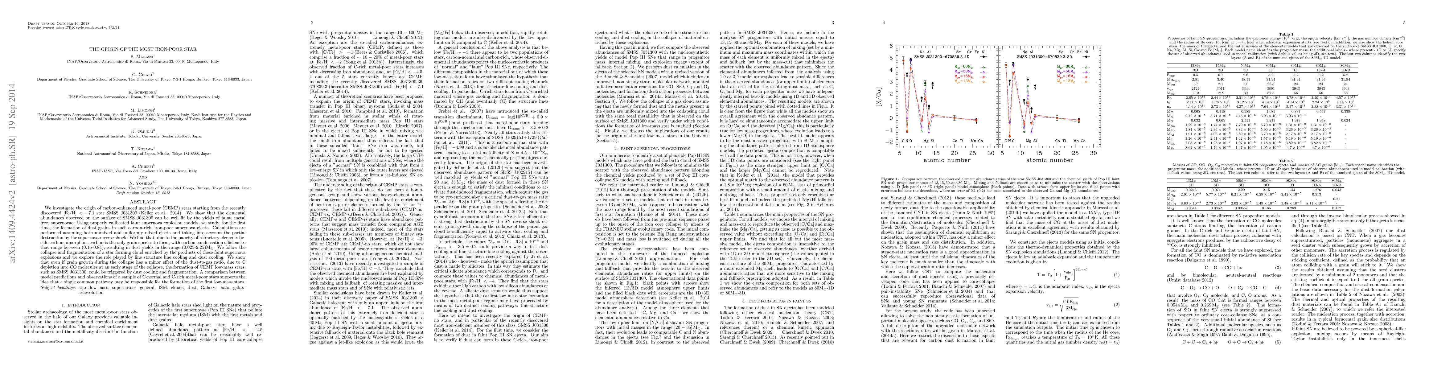 We investigate the origin of carbon-enhanced metal-poor (CEMP) stars starting from the recently discovered $\rm [Fe/H]<-7.1$ star SMSS J031300 (Keller et al. 2014). We show that the elemental abundances observed on the surface of SMSS J031300 can be well fit by the yields of faint, metal free, supernovae. Using properly calibrated faint supernova explosion models, we study, for the first time, the formation of dust grains in such carbon-rich, iron-poor supernova ejecta. Calculations are performed assuming both unmixed and uniformly mixed ejecta and taking into account the partial destruction by the supernova reverse shock. We find that, due to the paucity of refractory elements beside carbon, amorphous carbon is the only grain species to form, with carbon condensation efficiencies that range between (0.15-0.84), resulting in dust yields in the range (0.025-2.25)M$_{\odot}$. We follow the collapse and fragmentation of a star forming cloud enriched by the products of these faint supernova explosions and we explore the role played by fine structure line cooling and dust cooling. We show that even if grain growth during the collapse has a minor effect of the dust-to-gas ratio, due to C depletion into CO molecules at an early stage of the collapse, the formation of CEMP low-mass stars, such as SMSS J031300, could be triggered by dust cooling and fragmentation. A comparison between model predictions and observations of a sample of C-normal and C-rich metal-poor stars supports the idea that a single common pathway may be responsible for the formation of the first low-mass stars.
