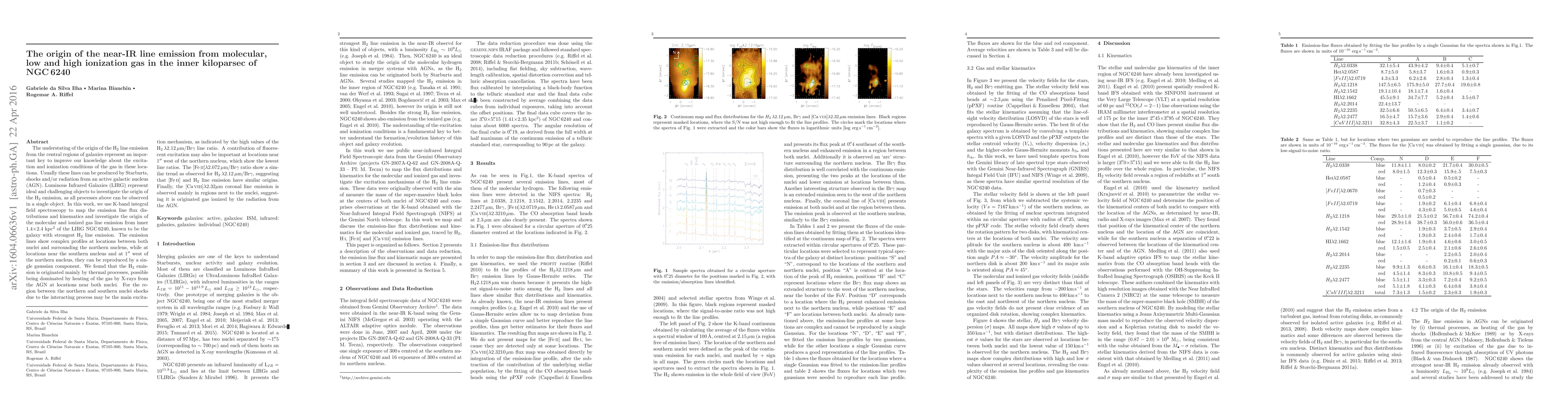 The understating of the origin of the H2 line emission from the central regions of galaxies represent an important key to improve our knowledge about the excitation and ionization conditions of the gas in these locations. Usually these lines can be produced by Starburts, shocks and/or radiation from an active galactic nucleus (AGN). Luminous Infrared Galaxies (LIRG) represent ideal and challenging objects to investigate the origin of the H2 emission, as all processes above can be observed in a single object. In this work, we use K-band integral field spectroscopy to map the emission line flux distributions and kinematics and investigate the origin of the molecular and ionized gas line emission from inner 1.4x2.4 kpc2 of the LIRG NGC6240, known to be the galaxy with strongest H2 line emission. The emission lines show complex profiles at locations between both nuclei and surrounding the northern nucleus, while at locations near the southern nucleus and at 1" west of the northern nucleus, they can be reproduced by a single gaussian component. We found that the H2 emission is originated mainly by thermal processes, possible being dominated by heating of the gas by X-rays from the AGN at locations near both nuclei. For the region between the northern and southern nuclei shocks due to the interacting process may be the main excitation mechanism, as indicated by the high values of the H2l2.12um/Brg line ratio. A contribution of fluorescent excitation may also be important at locations near 1" west of the northern nucleus, which show the lowest line ratios. The [FeII]l2.072um/Brg ratio show a similar trend as observed for H2l2.12um/Brg, suggesting that [FeII] and H2 line emission have similar origins. Finally, the [CaVIII]l2.32um coronal line emission is observed mainly in regions next to the nuclei, suggesting it is originated gas ionized by the radiation from the AGN.