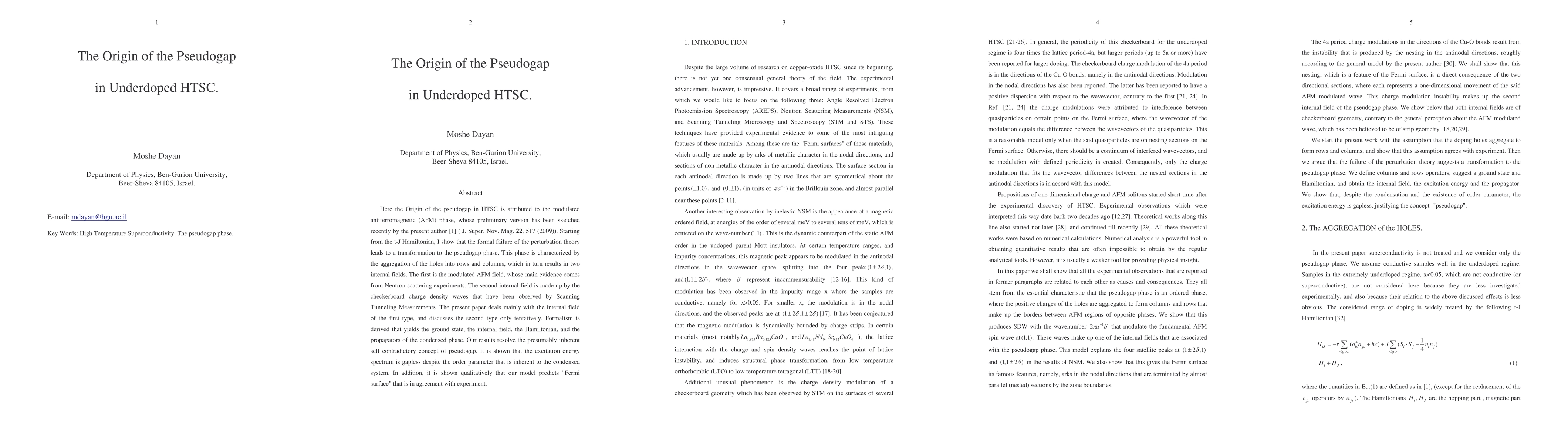 Here the Origin of the pseudogap in HTSC is attributed to the modulated antiferromagnetic (AFM) phase, whose preliminary version has been sketched recently by the present author [1](arXiv:0901.3896v2 (cond.-mat.sup-con)). Starting from the t-J Hamiltonian, I show that the formal failure of the perturbation theory leads to a transformation to the pseudogap phase. This phase is characterized by the aggregation of the holes into rows and columns, which in turn results in two internal fields. The first is the modulated AFM field, whose main evidence comes from Neutron scattering experiments. The second internal field is made up by the checkerboard charge density waves that have been observed by Scanning Tunneling Measurements. The present paper deals mainly with the internal field of the first type, and discusses the second type only tentatively. Formalism is derived that yields the ground state, the internal field, the Hamiltonian, and the propagators of the condensed phase. Our results resolve the presumably inherent self contradictory concept of pseudogap. It is shown that the excitation energy spectrum is gapless despite the order parameter that is inherent to the condensed system. In addition, it is shown qualitatively that our model predicts "Fermi surface" that is in agreement with experiment.