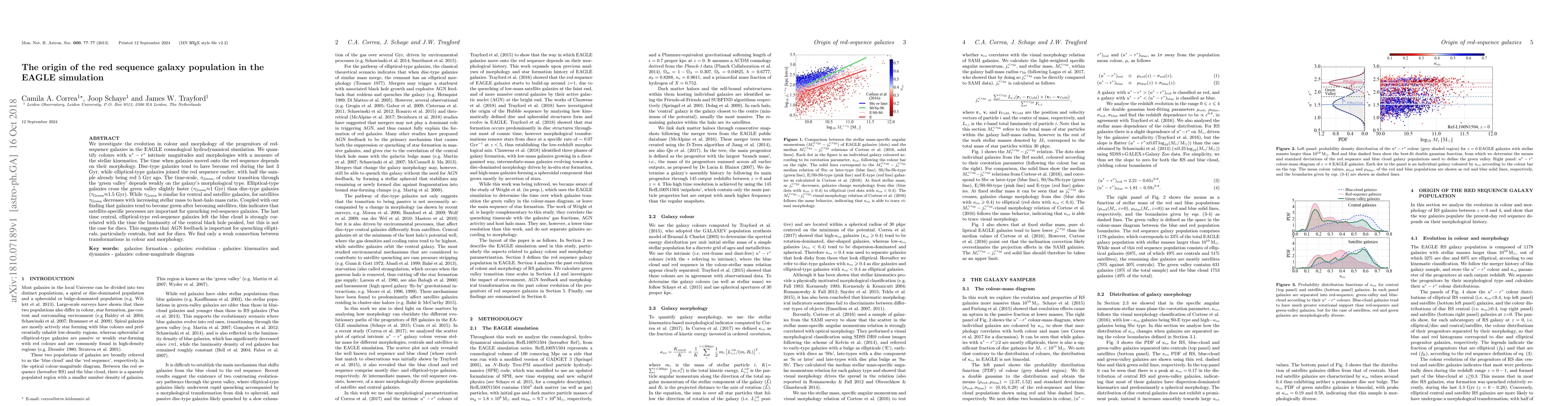 We investigate the evolution in colour and morphology of the progenitors of red-sequence galaxies in the EAGLE cosmological hydrodynamical simulation. We quantify colours with $u^{*}-r^{*}$ intrinsic magnitudes and morphologies with a measure of the stellar kinematics. The time when galaxies moved onto the red sequence depends on their morphology. Disc-type galaxies tend to have become red during the last 3 Gyr, while elliptical-type galaxies joined the red sequence earlier, with half the sample already being red 5 Gyr ago. The time-scale, $\tau_{\rm{Green}}$, of colour transition through the `green valley' depends weakly on the galaxy's morphological type. Elliptical-type galaxies cross the green valley slightly faster ($\tau_{\rm{Green}}{\approx}1$ Gyr) than disc-type galaxies ($\tau_{\rm{Green}}{\approx}$1.5 Gyr). While $\tau_{\rm{Green}}$ is similar for central and satellite galaxies, for satellites $\tau_{\rm{Green}}$ decreases with increasing stellar mass to host-halo mass ratio. Coupled with our finding that galaxies tend to become green after becoming satellites, this indicates that satellite-specific processes are important for quenching red-sequence galaxies. The last time central, elliptical-type red-sequence galaxies left the blue cloud is strongly correlated with the time the luminosity of the central black hole peaked, but this is not the case for discs. This suggests that AGN feedback is important for quenching ellipticals, particularly centrals, but not for discs. We find only a weak connection between transformations in colour and morphology.