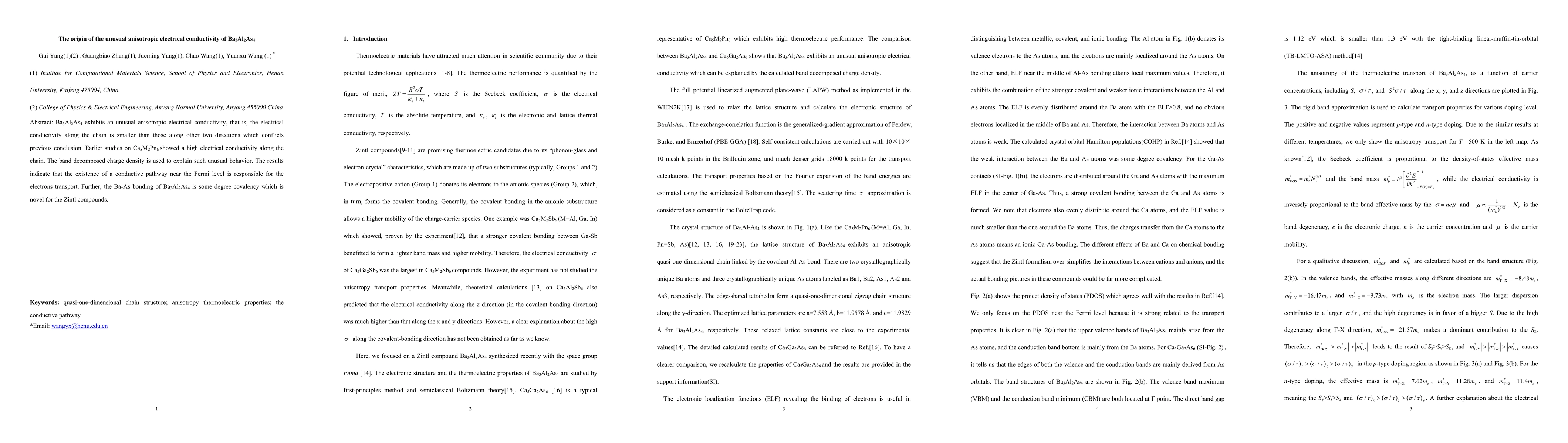 Researchers found that Ba3Al2As4 exhibits unusual anisotropic electrical conductivity, where conductivity is smaller along the chain compared to other directions. The band decomposed charge density suggests a conductive pathway near the Fermi level is responsible for electron transport.