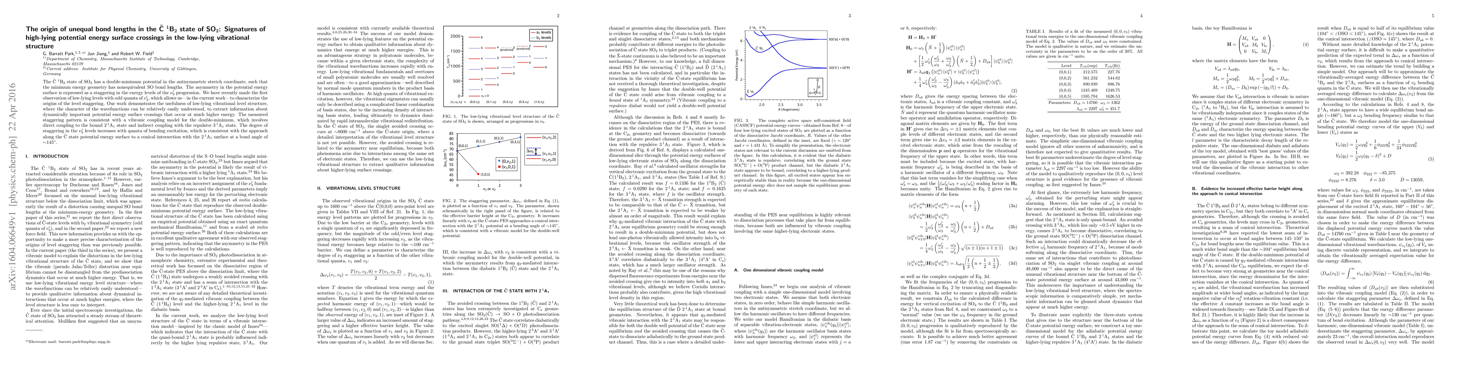 The $\mathrm{\tilde{C}}$ $^1$B$_2$ state of SO$_2$ has a double-minimum potential in the antisymmetric stretch coordinate, such that the minimum energy geometry has nonequivalent SO bond lengths. The asymmetry in the potential energy surface is expressed as a staggering in the energy levels of the $\nu_3'$ progression. We have recently made the first observation of low-lying levels with odd quanta of $v_3'$, which allows us--in the current work--to characterize the origins of the level staggering. Our work demonstrates the usefulness of low-lying vibrational level structure, where the character of the wavefunctions can be relatively easily understood, to extract information about dynamically important potential energy surface crossings that occur at much higher energy. The measured staggering pattern is consistent with a vibronic coupling model for the double-minimum, which involves direct coupling to the bound 2$^1$A$_1$ state and indirect coupling with the repulsive 3$^1$A$_1$ state. The degree of staggering in the $\nu_3'$ levels increases with quanta of bending excitation, which is consistent with the approach along the $\mathrm{\tilde{C}}$ state potential energy surface to a conical intersection with the 2$^1$A$_1$ surface at a bond angle of $\sim$145$^{\circ}$.