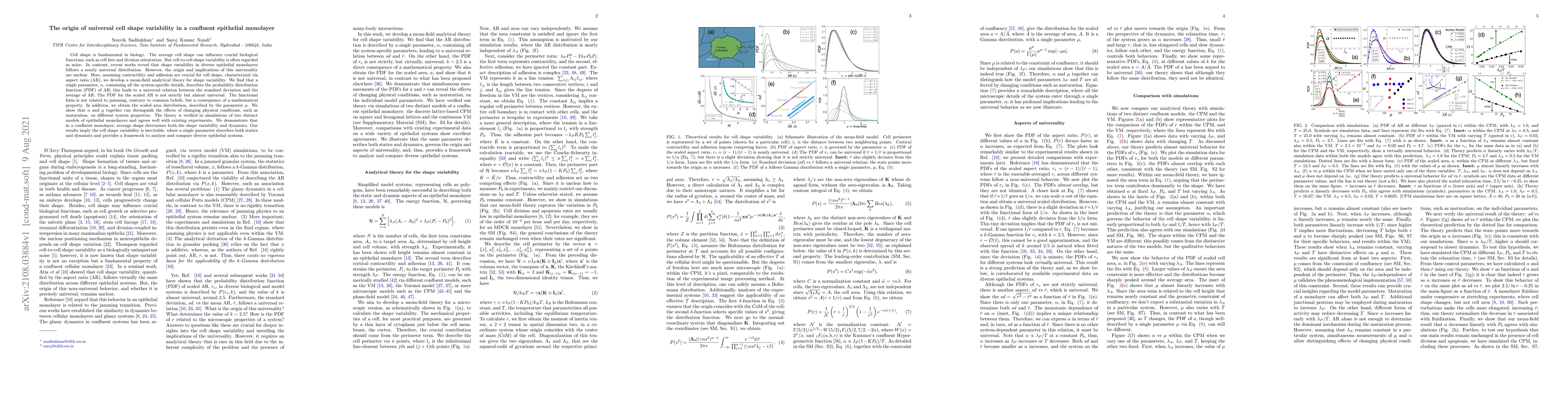 This paper develops a theoretical framework to explain the universal distribution of cell shape variability in epithelial monolayers, showing that a single parameter, $\alpha$, governs the probability distribution of cell aspect ratio. The findings suggest that this variability is not random but follows a nearly universal pattern, driven by contractility and adhesion, and provides a method to analyze the effects of physical conditions on cell shape dynamics.