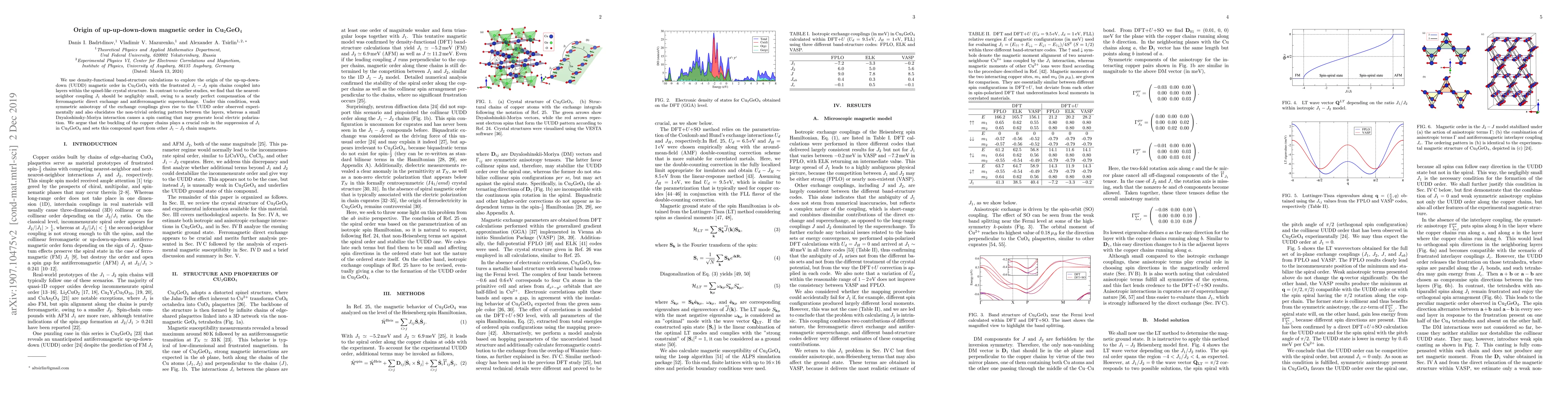 We use density-functional band-structure calculations to explore the origin of the up-up-down-down (UUDD) magnetic order in Cu$_2$GeO$_4$ with the frustrated $J_1-J_2$ spin chains coupled into layers within the spinel-like crystal structure. In contrast to earlier studies, we find that the nearest-neighbor coupling $J_1$ may be negligibly small, owing to a nearly perfect compensation of the ferromagnetic direct exchange and antiferromagnetic superexchange. Under this condition, weak symmetric anisotropy of the exchange couplings gives rise to the UUDD order observed experimentally and also elucidates the non-trivial ordering pattern between the layers, whereas a small Dzyaloshinsky-Moriya interaction causes a spin canting that may generate local electric polarization. We argue that the buckling of the copper chains plays a crucial role in the suppression of $J_1$ in Cu$_2$GeO$_4$ and sets this compound apart from other $J_1-J_2$ chain magnets.