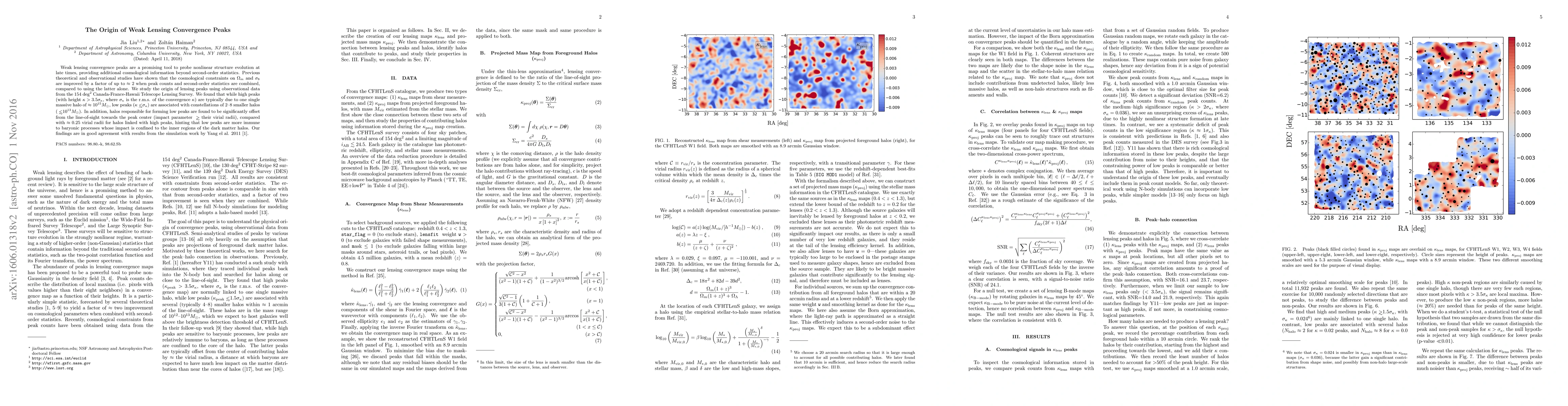 Weak lensing convergence peaks are a promising tool to probe nonlinear structure evolution at late times, providing additional cosmological information beyond second-order statistics. Previous theoretical and observational studies have shown that the cosmological constraints on $\Omega_m$ and $\sigma_8$ are improved by a factor of up to ~ 2 when peak counts and second-order statistics are combined, compared to using the latter alone. We study the origin of lensing peaks using observational data from the 154 deg$^2$ Canada-France-Hawaii Telescope Lensing Survey. We found that while high peaks (with height $\kappa$ >3.5 $\sigma_\kappa$, where $\sigma_\kappa$ is the r.m.s. of the convergence $\kappa$) are typically due to one single massive halo of ~$10^{15}M_\odot$, low peaks ($\kappa$ <~ $\sigma_\kappa$) are associated with constellations of 2-8 smaller halos (<~$10^{13}M_\odot$). In addition, halos responsible for forming low peaks are found to be significantly offset from the line-of-sight towards the peak center (impact parameter >~ their virial radii), compared with ~0.25 virial radii for halos linked with high peaks, hinting that low peaks are more immune to baryonic processes whose impact is confined to the inner regions of the dark matter halos. Our findings are in good agreement with results from the simulation work by Yang el al. (2011).