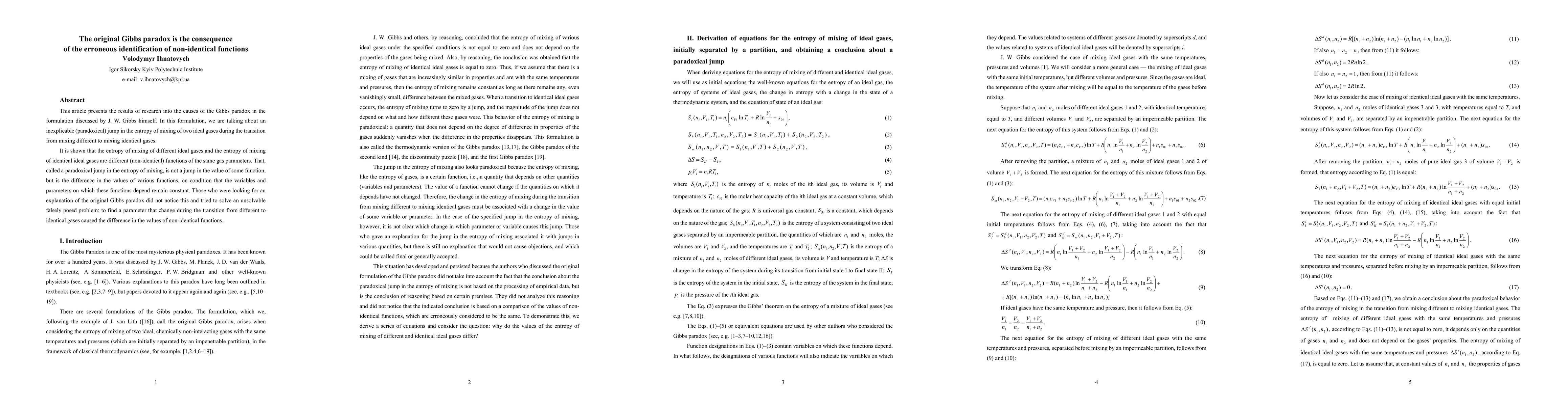 This article presents the results of research into the causes of the Gibbs paradox in the formulation discussed by J. W. Gibbs himself. In this formulation, we are talking about an inexplicable (paradoxical) jump in the entropy of mixing of two ideal gases during the transition from mixing different to mixing identical gases. It is shown that the entropy of mixing of different ideal gases and the entropy of mixing of identical ideal gases are different (non-identical) functions of the same gas parameters. That, called a paradoxical jump in the entropy of mixing, is not a jump in the value of some function, but is the difference in the values of various functions, on condition that the variables and parameters on which these functions depend remain constant. Those who were looking for an explanation of the original Gibbs paradox did not notice this and tried to solve an unsolvable falsely posed problem: to find a parameter that change during the transition from different to identical gases caused the difference in the values of non-identical functions.