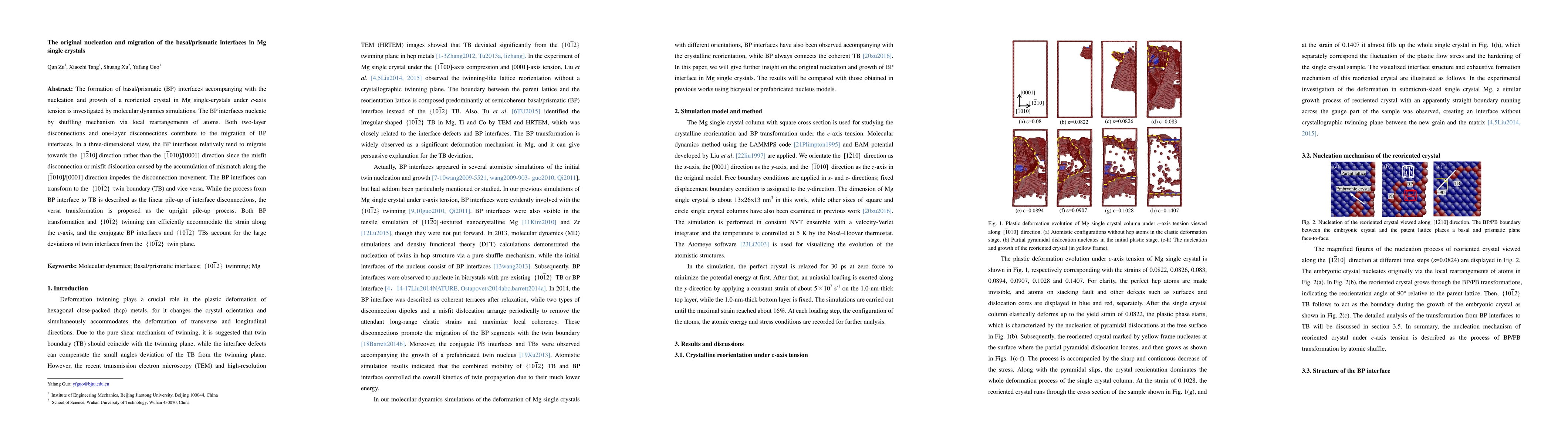The formation of basal/prismatic (BP) interfaces accompanying with the nucleation and growth of a reoriented crystal in Mg single-crystals under c-axis tension is investigated by molecular dynamics simulations. The BP interfaces nucleate by shuffling mechanism via local rearrangements of atoms. Both two-layer disconnections and one-layer disconnections contribute to the migration of BP interfaces. In a three-dimensional view, the BP interfaces relatively tend to migrate towards the [1-210] direction rather than the [-1010]/[0001] direction since the misfit disconnection or misfit dislocation caused by the accumulation of mismatch along the [-1010] /[0001] direction impedes the disconnection movement. The BP interfaces can transform to the {10-12} twin boundary (TB) and vice versa. While the process from BP interface to TB is described as the linear pile-up of interface disconnections, the versa transformation is proposed as the upright pile-up process. Both BP transformation and {10-12} twinning can efficiently accommodate the strain along the c-axis, and the conjugate BP interfaces and {10-12} TBs account for the large deviations of twin interfaces from the {10-12} twin plane.