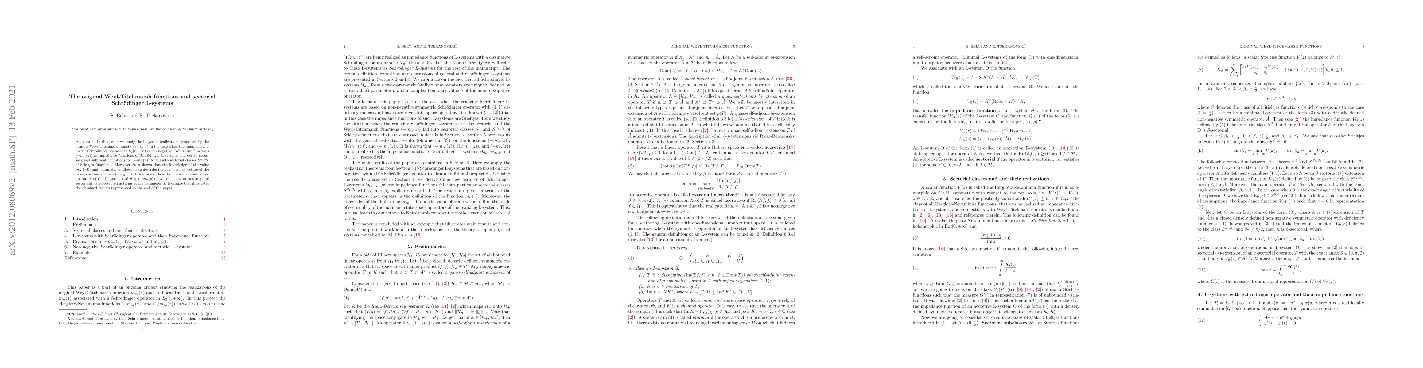In this paper we study the L-system realizations generated by the original Weyl-Titchmarsh functions $m_\alpha(z)$ in the case when the minimal symmetric Shr\"o\-dinger operator in $L_2[\ell,+\infty)$ is non-negative. We realize functions $(-m_\alpha(z))$ as impe\-dance functions of Shr\"odinger L-systems and derive necessary and sufficient conditions for $(-m_\alpha(z))$ to fall into sectorial classes $S^{\beta_1,\beta_2}$ of Stieltjes functions. Moreover, it is shown that the knowledge of the value $m_\infty(-0)$ and parameter $\alpha$ allows us to describe the geometric structure of the L-system that realizes $(-m_\alpha(z))$. Conditions when the main and state space operators of the L-system realizing $(-m_\alpha(z))$ have the same or not angle of sectoriality are presented in terms of the parameter $\alpha$. Example that illustrates the obtained results is presented in the end of the paper.