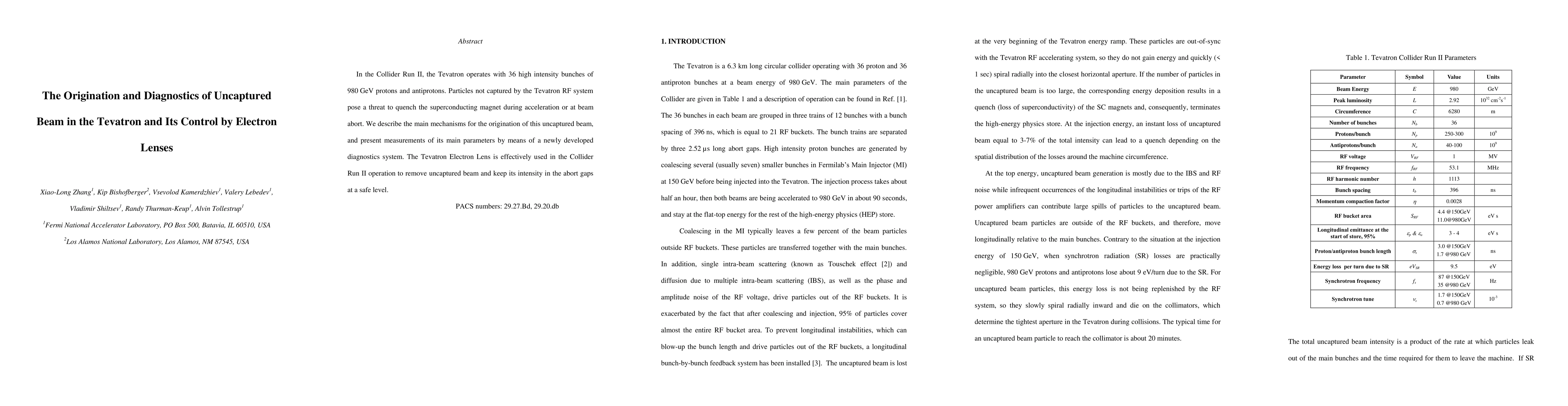 Summary: This paper investigates the origination and diagnostics of uncaptured beam particles in the Tevatron during Collider Run II, highlighting mechanisms that lead to their formation and presenting a new diagnostic system for measuring these particles. The use of Tevatron Electron Lenses is shown to effectively control and reduce the intensity of uncaptured beam in abort gaps, ensuring safe operation.