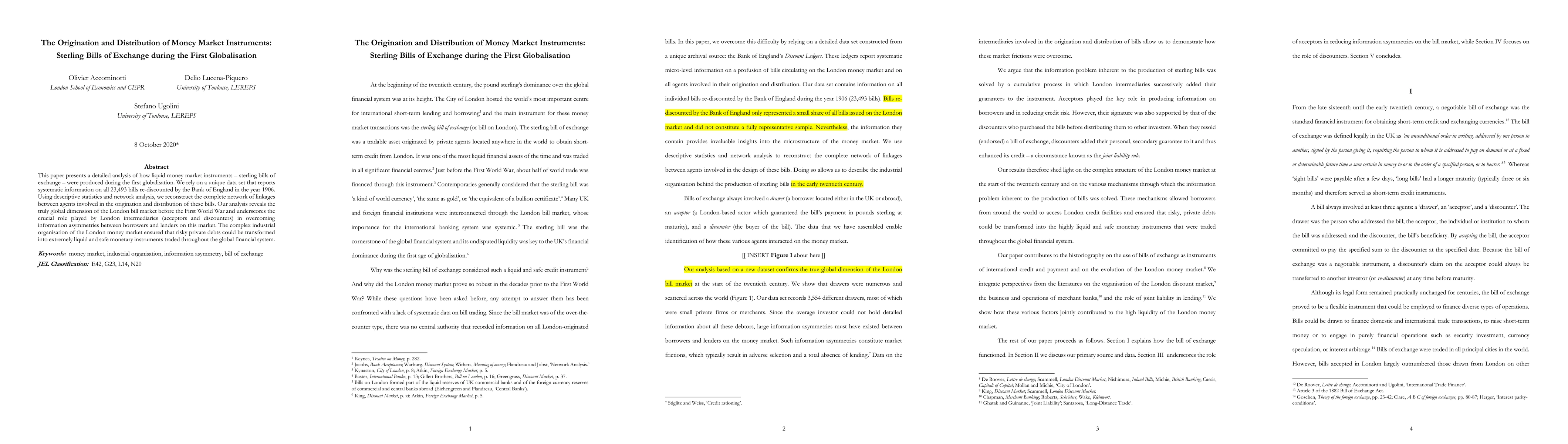 This paper presents a detailed analysis of how liquid money market instruments -- sterling bills of exchange -- were produced during the first globalisation. We rely on a unique data set that reports systematic information on all 23,493 bills re-discounted by the Bank of England in the year 1906. Using descriptive statistics and network analysis, we reconstruct the complete network of linkages between agents involved in the origination and distribution of these bills. Our analysis reveals the truly global dimension of the London bill market before the First World War and underscores the crucial role played by London intermediaries (acceptors and discounters) in overcoming information asymmetries between borrowers and lenders on this market. The complex industrial organisation of the London money market ensured that risky private debts could be transformed into extremely liquid and safe monetary instruments traded throughout the global financial system.