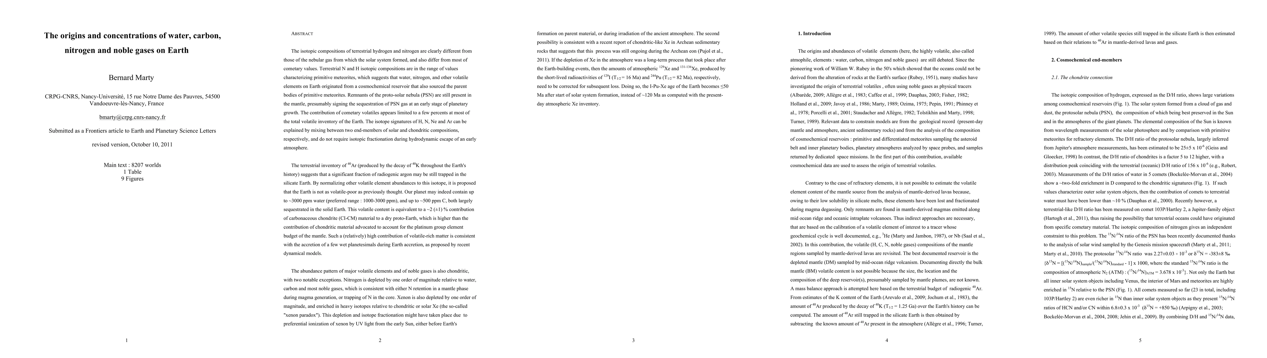 This paper explores the origins and concentrations of water, carbon, nitrogen, and noble gases on Earth, suggesting that terrestrial volatiles likely originated from a cosmochemical reservoir similar to primitive meteorites. It proposes that Earth's volatile content is higher than previously thought, with up to ~3000 ppm water and ~500 ppm carbon largely sequestered in the solid Earth, indicating a significant contribution from carbonaceous chondrite material.