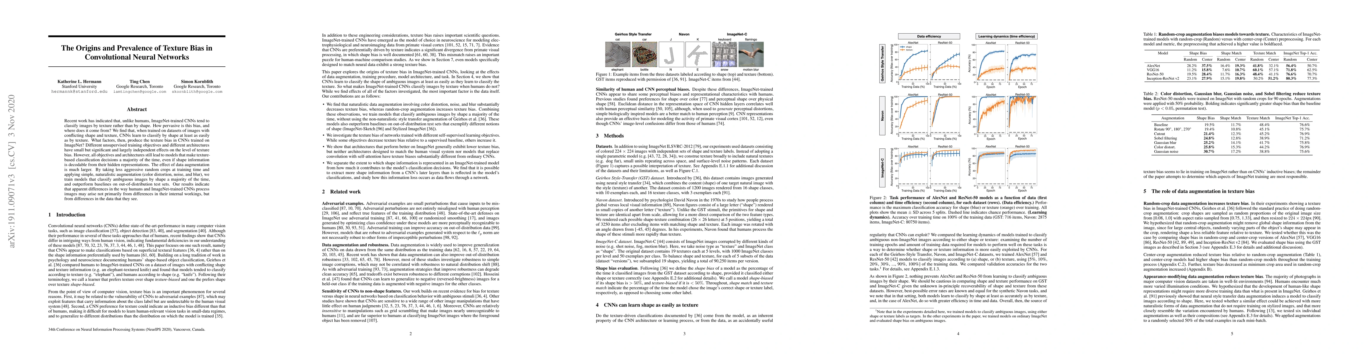 Recent work has indicated that, unlike humans, ImageNet-trained CNNs tend to classify images by texture rather than by shape. How pervasive is this bias, and where does it come from? We find that, when trained on datasets of images with conflicting shape and texture, CNNs learn to classify by shape at least as easily as by texture. What factors, then, produce the texture bias in CNNs trained on ImageNet? Different unsupervised training objectives and different architectures have small but significant and largely independent effects on the level of texture bias. However, all objectives and architectures still lead to models that make texture-based classification decisions a majority of the time, even if shape information is decodable from their hidden representations. The effect of data augmentation is much larger. By taking less aggressive random crops at training time and applying simple, naturalistic augmentation (color distortion, noise, and blur), we train models that classify ambiguous images by shape a majority of the time, and outperform baselines on out-of-distribution test sets. Our results indicate that apparent differences in the way humans and ImageNet-trained CNNs process images may arise not primarily from differences in their internal workings, but from differences in the data that they see.