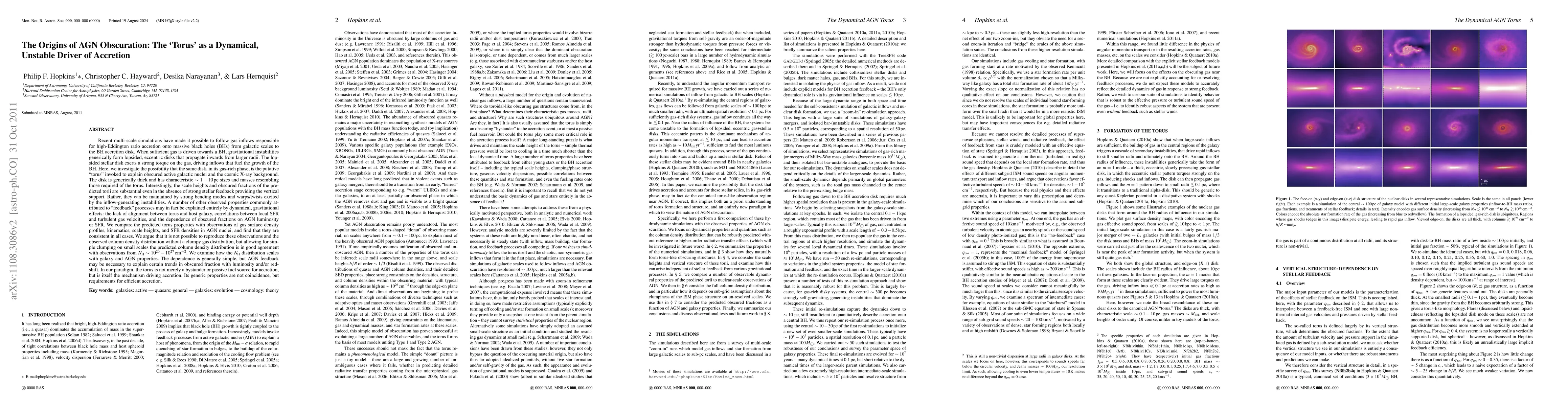 This paper investigates the formation of the "torus" around active galactic nuclei (AGN) as a dynamic, unstable structure driven by gravitational instabilities in gas disks. The study finds that the torus's properties, such as scale heights and obscured fractions, can be explained by the dynamics of the gas disk rather than solely by stellar feedback, suggesting the torus itself is a key driver of accretion onto the black hole.