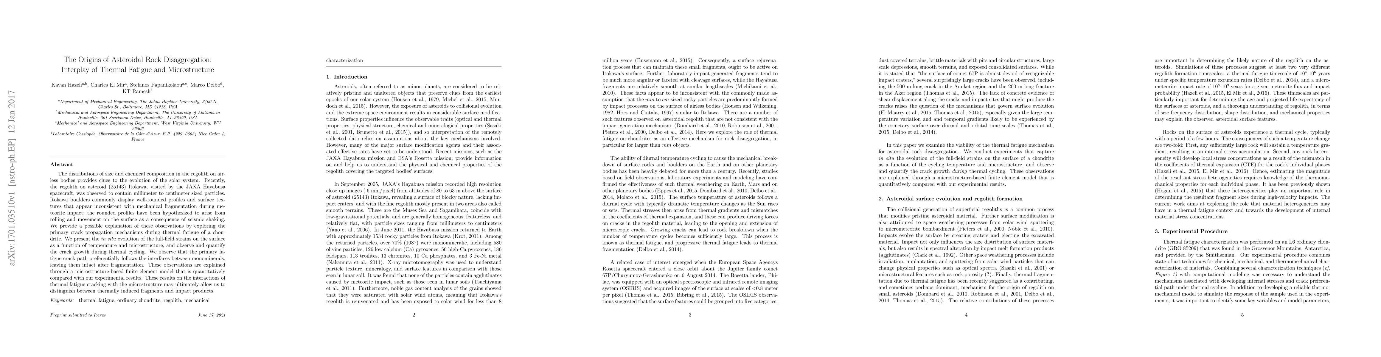 The distributions of size and chemical composition in the regolith on airless bodies provides clues to the evolution of the solar system. Recently, the regolith on asteroid (25143) Itokawa, visited by the JAXA Hayabusa spacecraft, was observed to contain millimeter to centimeter sized particles. Itokawa boulders commonly display well-rounded profiles and surface textures that appear inconsistent with mechanical fragmentation during meteorite impact; the rounded profiles have been hypothesized to arise from rolling and movement on the surface as a consequence of seismic shaking. We provide a possible explanation of these observations by exploring the primary crack propagation mechanisms during thermal fatigue of a chondrite. We present the in situ evolution of the full-field strains on the surface as a function of temperature and microstructure, and observe and quantify the crack growth during thermal cycling. We observe that the primary fatigue crack path preferentially follows the interfaces between monominerals, leaving them intact after fragmentation. These observations are explained through a microstructure-based finite element model that is quantitatively compared with our experimental results. These results on the interactions of thermal fatigue cracking with the microstructure may ultimately allow us to distinguish between thermally induced fragments and impact products.
