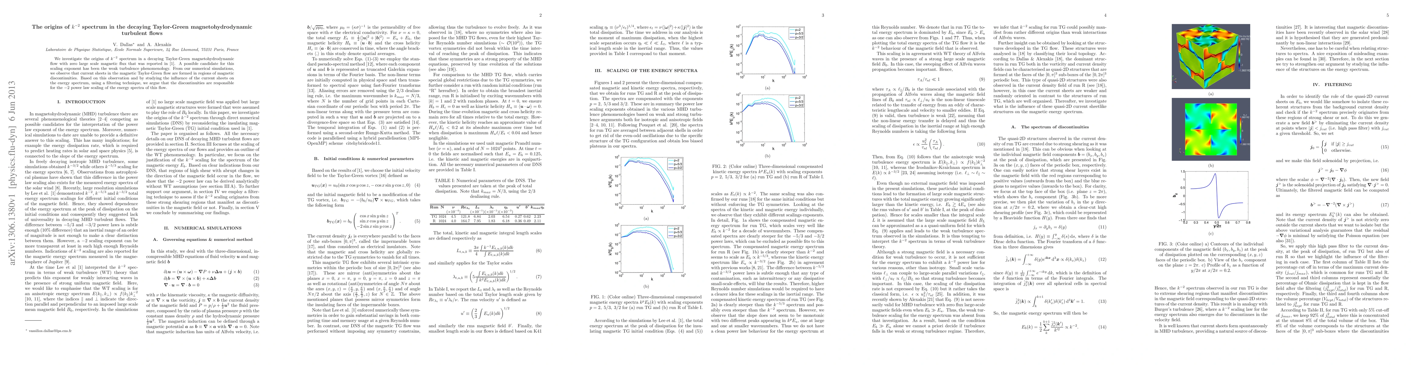 We investigate the origins of $k^{-2}$ spectrum in a decaying Taylor-Green magnetohydrodynamic flow with zero large scale magnetic flux that was reported in Lee et al. (2010). A possible candidate for this scaling exponent has been the weak turbulence phenomenology. From our numerical simulations, we observe that current sheets in the magnetic Taylor-Green flow are formed in regions of magnetic discontinuities. Based on this observation and by studying the influence of the current sheets on the energy spectrum, using a filtering technique, we argue that the discontinuities are responsible for the $-2$ power law scaling of the energy spectra of this flow.