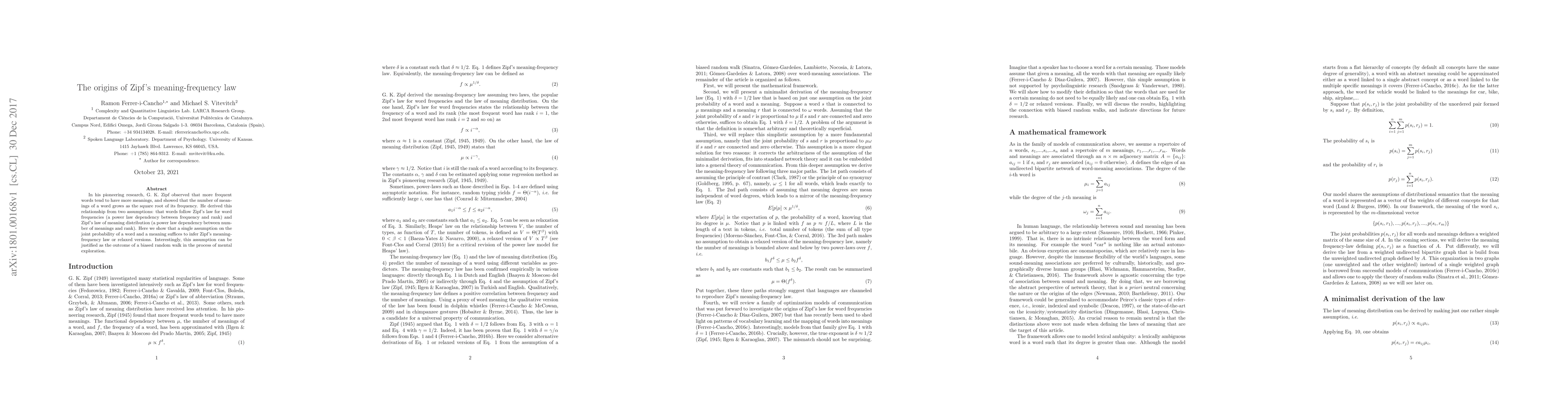 This paper demonstrates that a single assumption about the joint probability of words and their meanings can derive Zipf's meaning-frequency law, showing that more frequent words tend to have more meanings. It also suggests that this assumption can arise from a biased random walk in mental exploration.