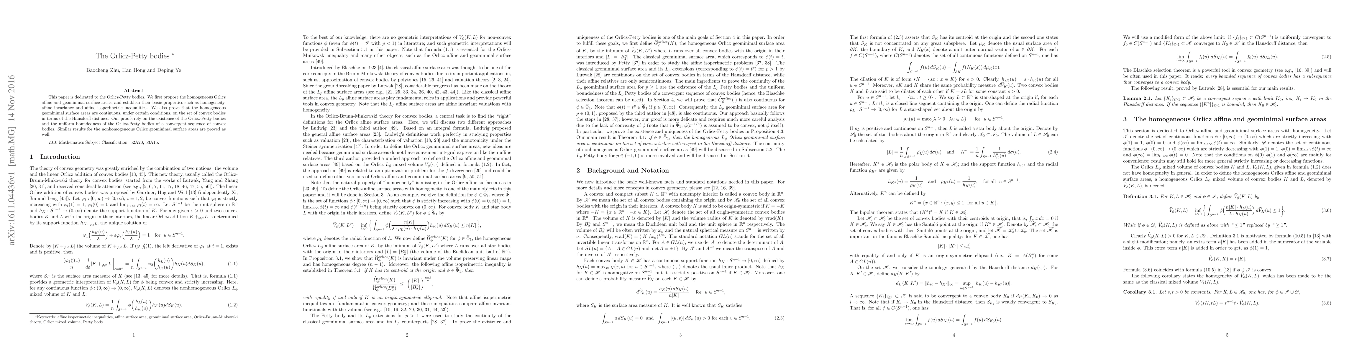 This paper introduces the Orlicz-Petty bodies and establishes their properties, including homogeneity, affine invariance, and affine isoperimetric inequalities. It also proves the continuity of homogeneous geominimal surface areas under certain conditions and extends similar results to nonhomogeneous cases.