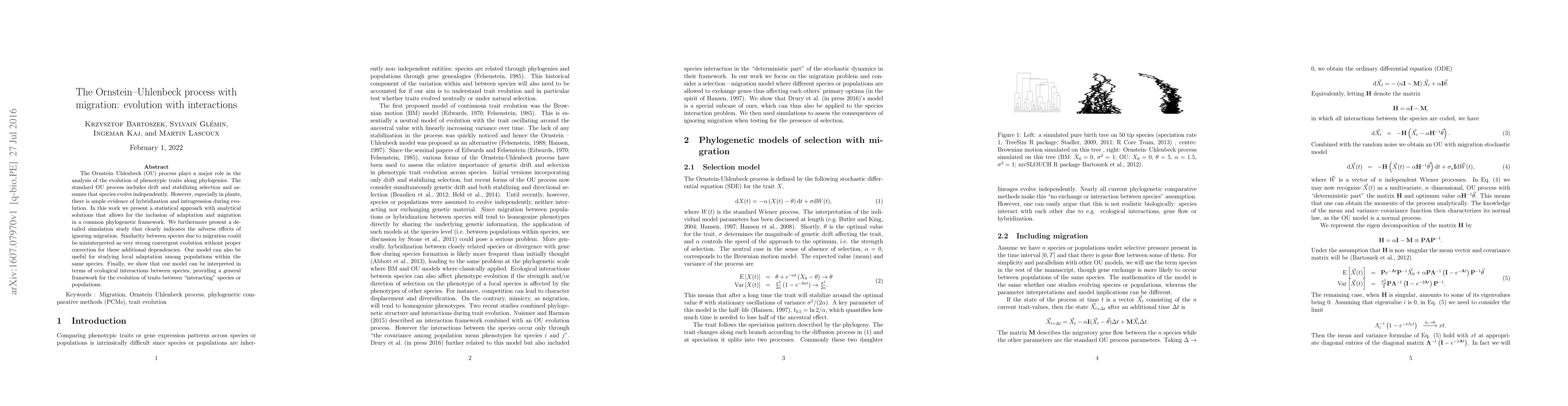 This paper introduces a modified Ornstein-Uhlenbeck process that incorporates migration and adaptation, providing a statistical framework for analyzing phenotypic trait evolution in the presence of hybridization and introgression. The model highlights the misinterpretation risks of ignoring migration and offers a general framework for studying ecological interactions and local adaptation.