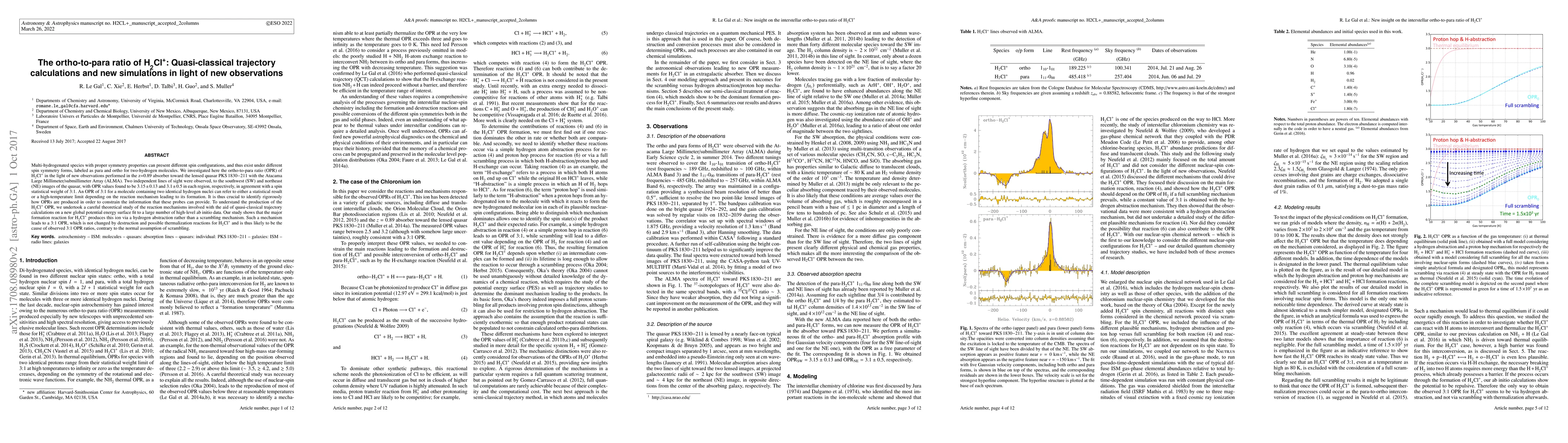 Multi-hydrogenated species with proper symmetry properties can present different spin configurations, and thus exist under different spin symmetry forms, labeled as para and ortho for two-hydrogen molecules. We investigated here the ortho-to-para ratio (OPR) of H$_2$Cl$^+$ in the light of new observations performed in the z=0.89 absorber toward the lensed quasar PKS 1830-211 with the Atacama Large Millimeter/submillimeter Array (ALMA). Two independent lines of sight were observed, to the southwest (SW) and northeast (NE) images of the quasar, with OPR values found to be $3.15 \pm 0.13$ and $3.1 \pm 0.5$ in each region, respectively, in agreement with a spin statistical weight of 3:1. An OPR of 3:1 for a molecule containing two identical hydrogen nuclei can refer to either a statistical result or a high-temperature limit depending on the reaction mechanism leading to its formation. It is thus crucial to identify rigorously how OPRs are produced in order to constrain the information that these probes can provide. To understand the production of the H$_2$Cl$^+$ OPR, we undertook a careful theoretical study of the reaction mechanisms involved with the aid of quasi-classical trajectory calculations on a new global potential energy surface fit to a large number of high-level ab initio data. Our study shows that the major formation reaction for H$_2$Cl$^+$ produces this ion via a hydrogen abstraction rather than a scrambling mechanism. Such a mechanism leads to a 3:1 OPR, which is not changed by destruction and possible thermalization reactions for H$_2$Cl$^+$ and is thus likely to be the cause of observed 3:1 OPR ratios, contrary to the normal assumption of scrambling.
