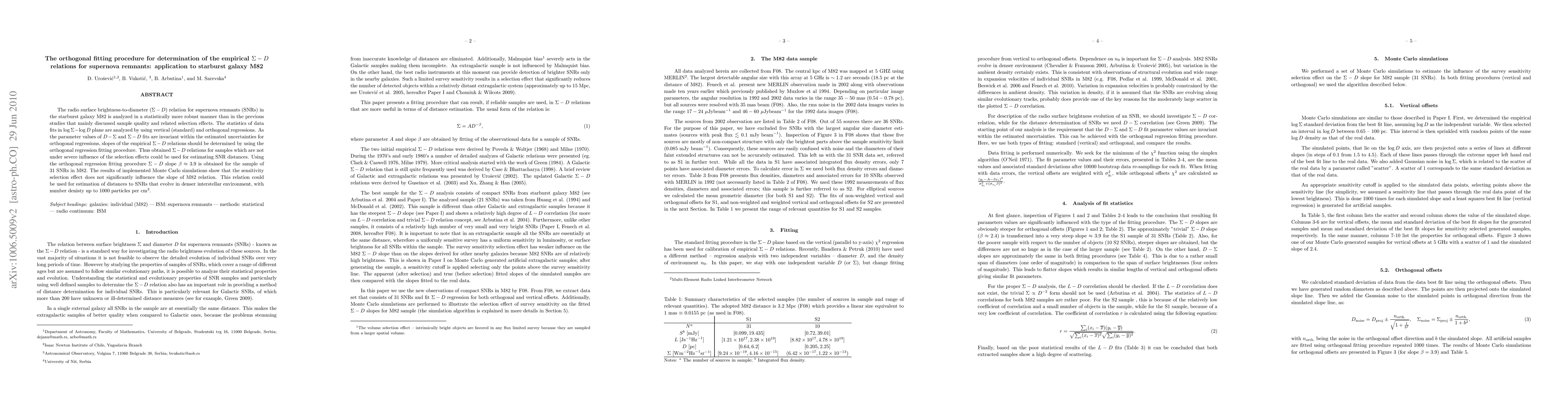 This paper employs orthogonal regression to determine the empirical Σ-D relation for supernova remnants in the starburst galaxy M82, finding a slope β ≈ 3.9. The orthogonal fitting method mitigates selection effects, allowing for reliable distance estimations for SNRs in denser interstellar environments.