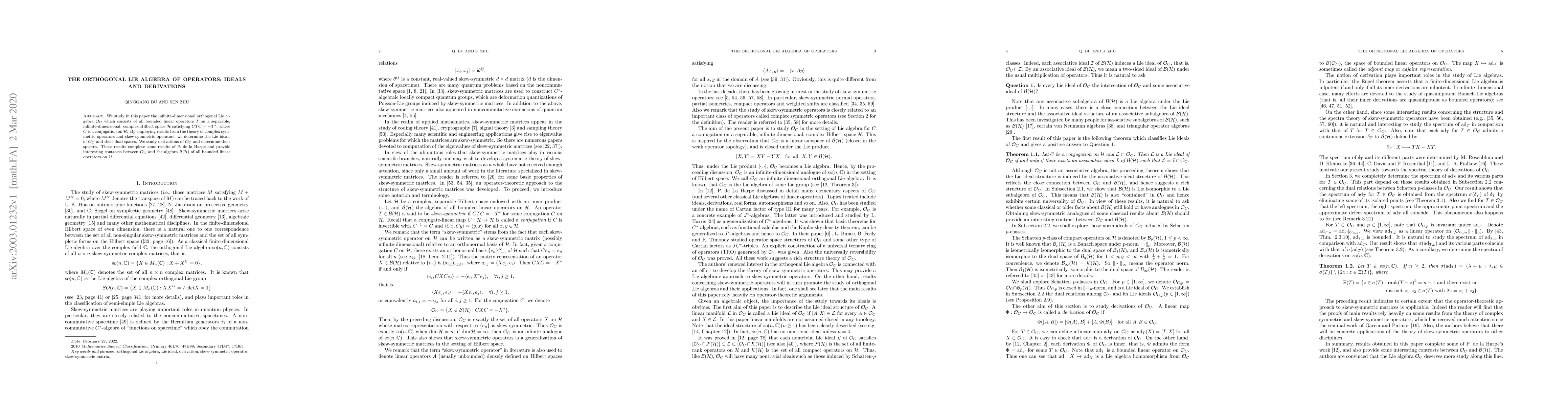 We study in this paper the infinite-dimensional orthogonal Lie algebra $\mathcal{O}_C$ which consists of all bounded linear operators $T$ on a separable, infinite-dimensional, complex Hilbert space $\mathcal{H}$ satisfying $CTC=-T^*$, where $C$ is a conjugation on $\mathcal{H}$. By employing results from the theory of complex symmetric operators and skew-symmetric operators, we determine the Lie ideals of $\mathcal{O}_C$ and their dual spaces. We study derivations of $\mathcal{O}_C$ and determine their spectra. These results complete some results of P. de la Harpe and provide interesting contrasts between $\mathcal{O}_C$ and the algebra $\mathcal{B(H)}$ of all bounded linear operators on $\mathcal{H}$.