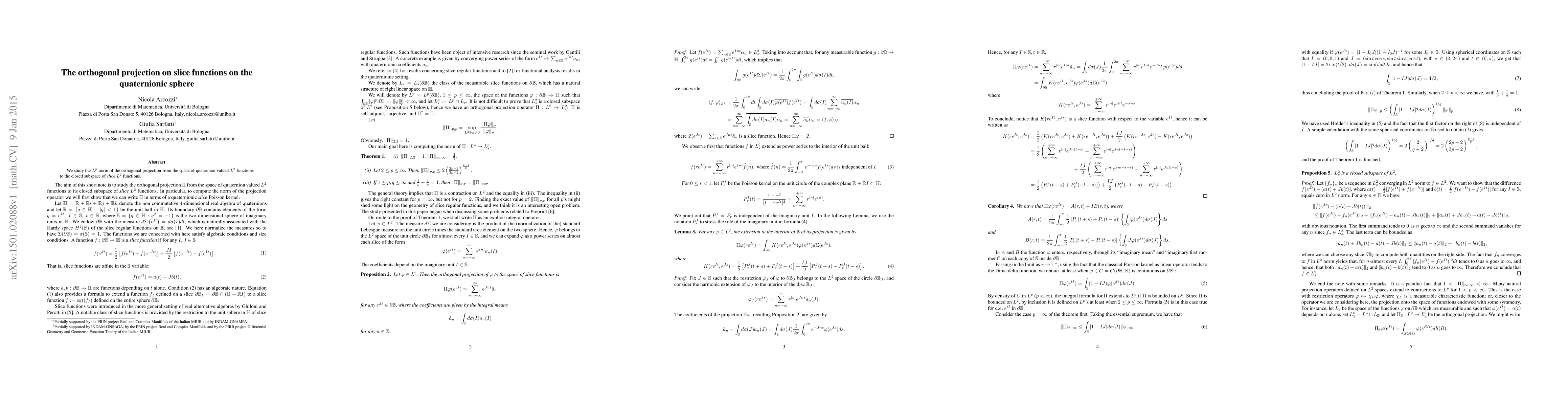 We study the $L^p$ norm of the orthogonal projection from the space of quaternion valued $L^2$ functions to the closed subspace of slice $L^2$ functions.