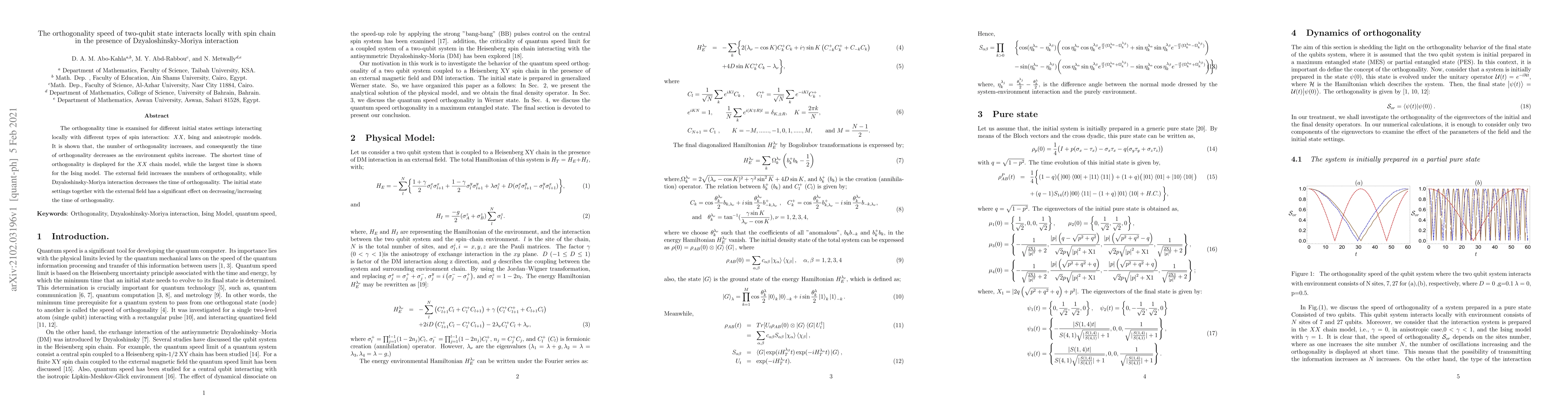 This study investigates the orthogonality speed of two-qubit states interacting with spin chains under various local spin interactions, revealing that the time to orthogonality decreases with more environment qubits and is shortest in $XX$ models but longest in Ising models. The presence of Dzyaloshinsky-Moriya interaction and external fields significantly influences the orthogonality dynamics.