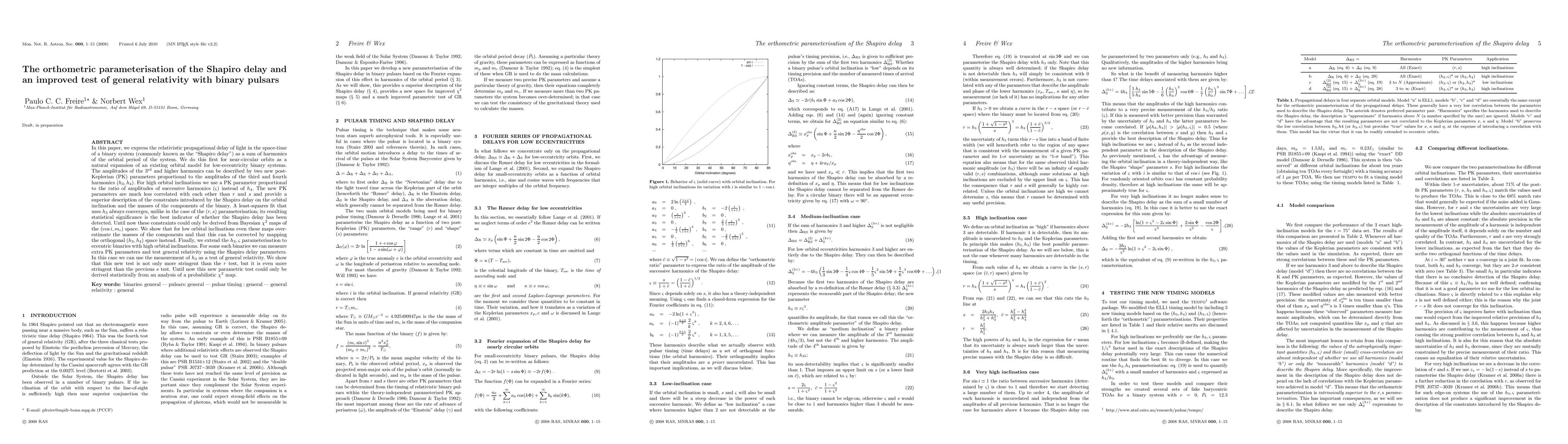 (abridged) In this paper, we express the relativistic propagational delay of light in the space-time of a binary system (commonly known as the "Shapiro delay") as a sum of harmonics of the orbital period of the system. We do this first for near-circular orbits as a natural expansion of an existing orbital model for low-eccentricity binary systems. The amplitudes of the 3rd and higher harmonics can be described by two new post-Keplerian (PK) parameters proportional to the amplitudes of the third and fourth harmonics (h_3, h_4). For high orbital inclinations we use a PK parameter proportional to the ratio of amplitudes of successive harmonics (sigma) instead of h_4. The new PK parameters are much less correlated with each other than r and s and provide a superior description of the constraints introduced by the Shapiro delay on the orbital inclination and the masses of the components of the binary (...). We extend the h_3,sigma parameterisation to eccentric binaries with high orbital inclinations. For some such binaries we can measure extra PK parameters and test general relativity using the Shapiro delay parameters. In this case we can use the measurement of h_3 as a test of general relativity. We show that this new test is not only more stringent than the r test, but it is even more stringent than the previous s test. Until now this new parametric test could only be derived statistically from an analysis of a probabilistic chi2 map.