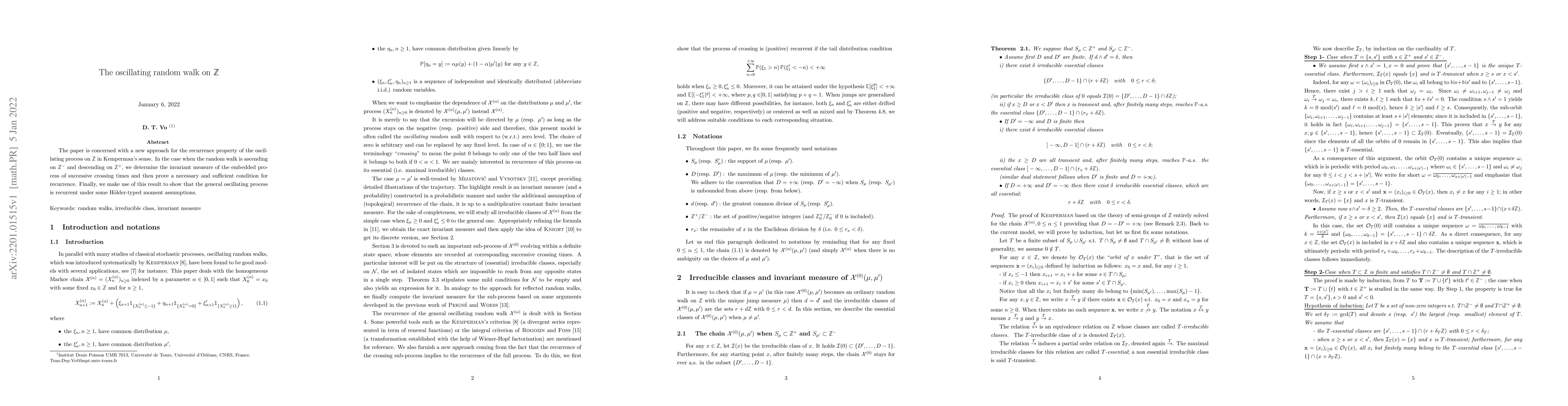 This paper investigates the recurrence property of an oscillating random walk on $\mathbb{Z}$, determining the invariant measure of crossing times and proving a condition for recurrence. It concludes that the process is recurrent under certain Hölder-type moment assumptions.