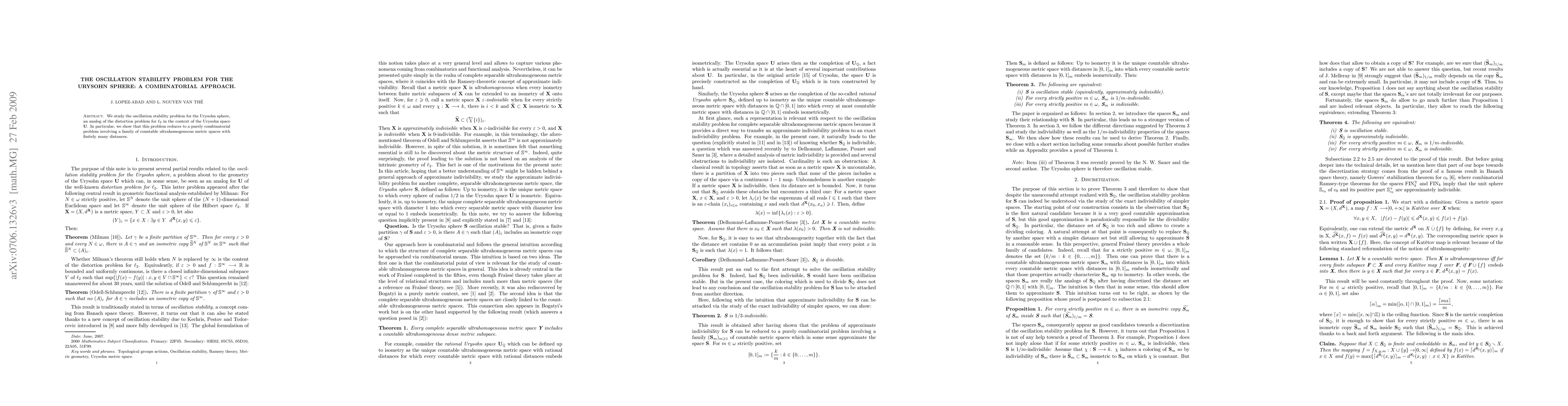 Summary: This paper investigates the oscillation stability problem for the Urysohn sphere, demonstrating that it can be reduced to a combinatorial issue concerning countable ultrahomogeneous metric spaces with a limited number of distances. The study provides a new perspective on the distortion problem in the Urysohn space.