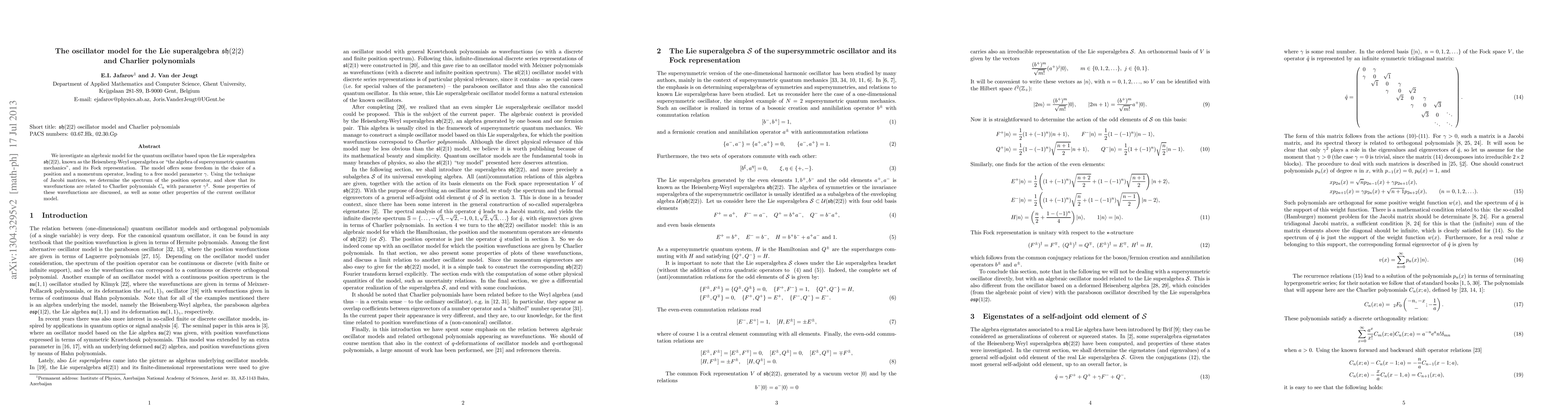 This paper explores an algebraic model for the quantum oscillator based on the Lie superalgebra sh(2|2), revealing a free model parameter gamma. It uses Jacobi matrices to determine the spectrum of the position operator, showing that its wavefunctions are related to Charlier polynomials C_n with parameter gamma^2.