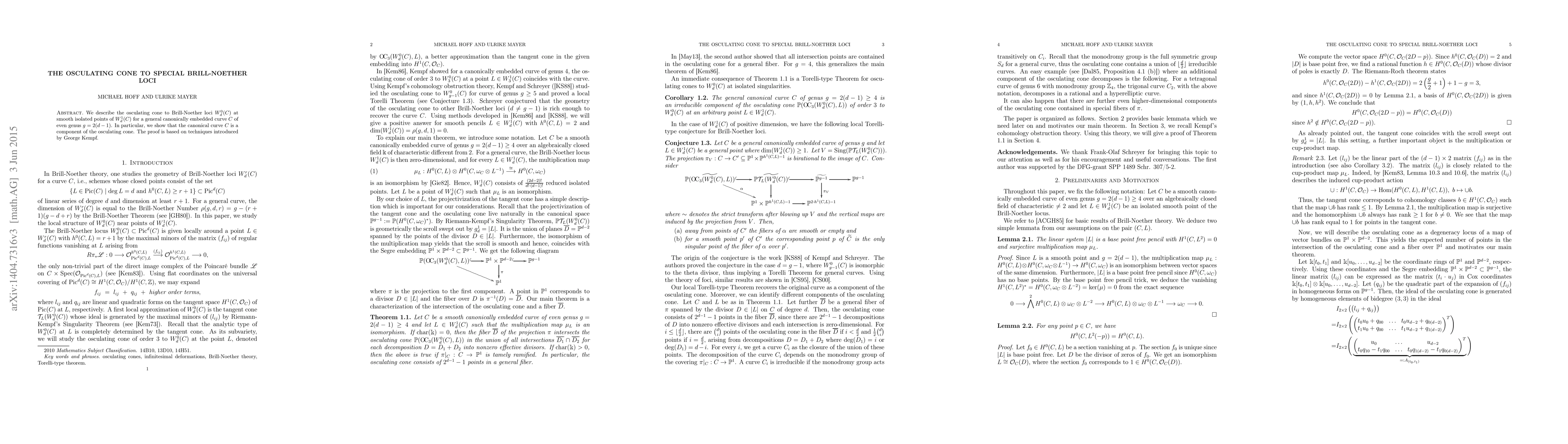 This paper describes the osculating cone to Brill-Noether loci for specific curve conditions, proving that the canonical curve is a component of this cone. The proof utilizes methods introduced by George Kempf in 1986.